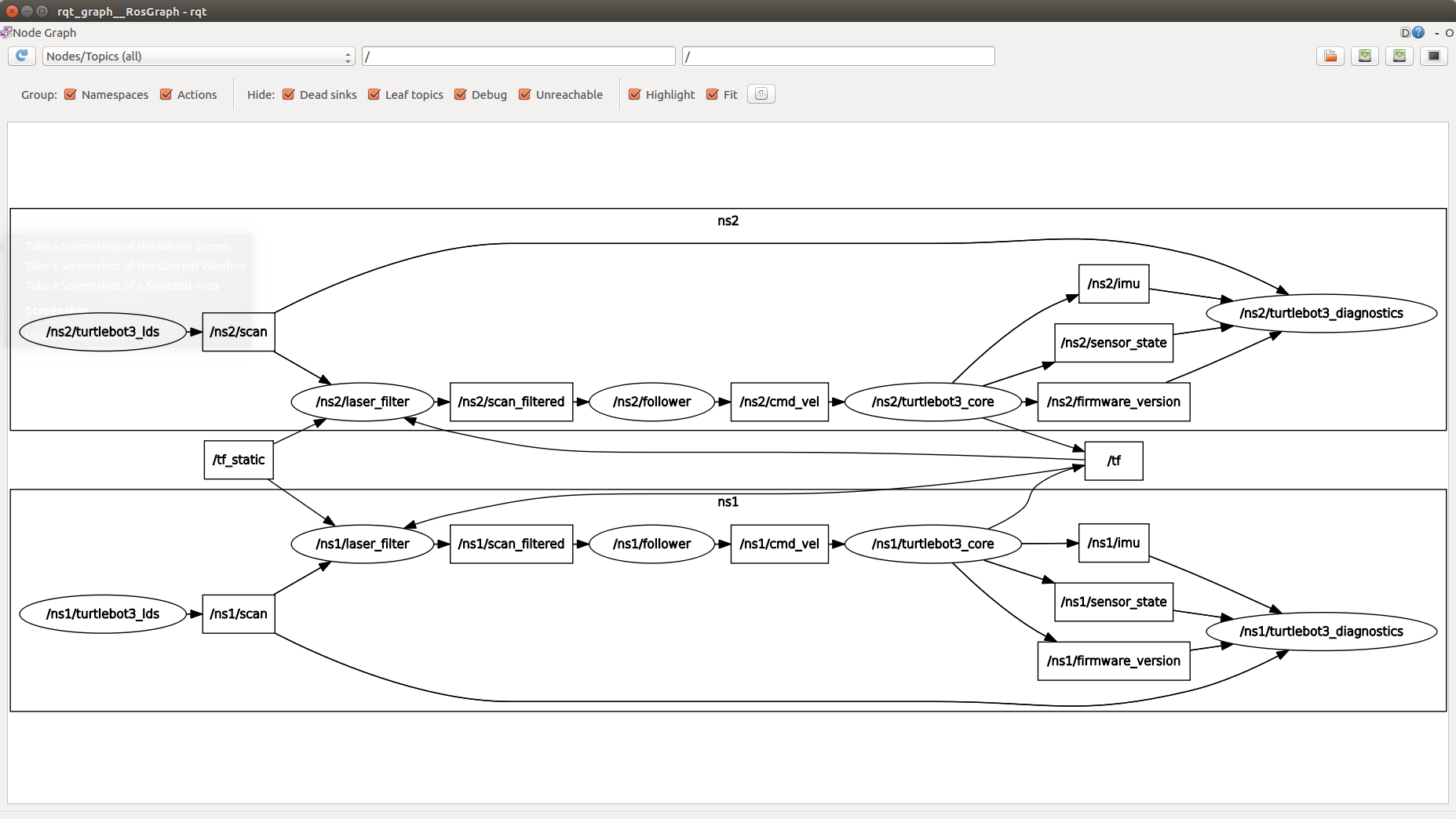 다음은 두 개 이상의 터틀봇을 실행한 상태이고, 네임스페이스가 tf를 제외하고는 분리되었지만 아직 tf에 대한 문제는 해결되지 않았다