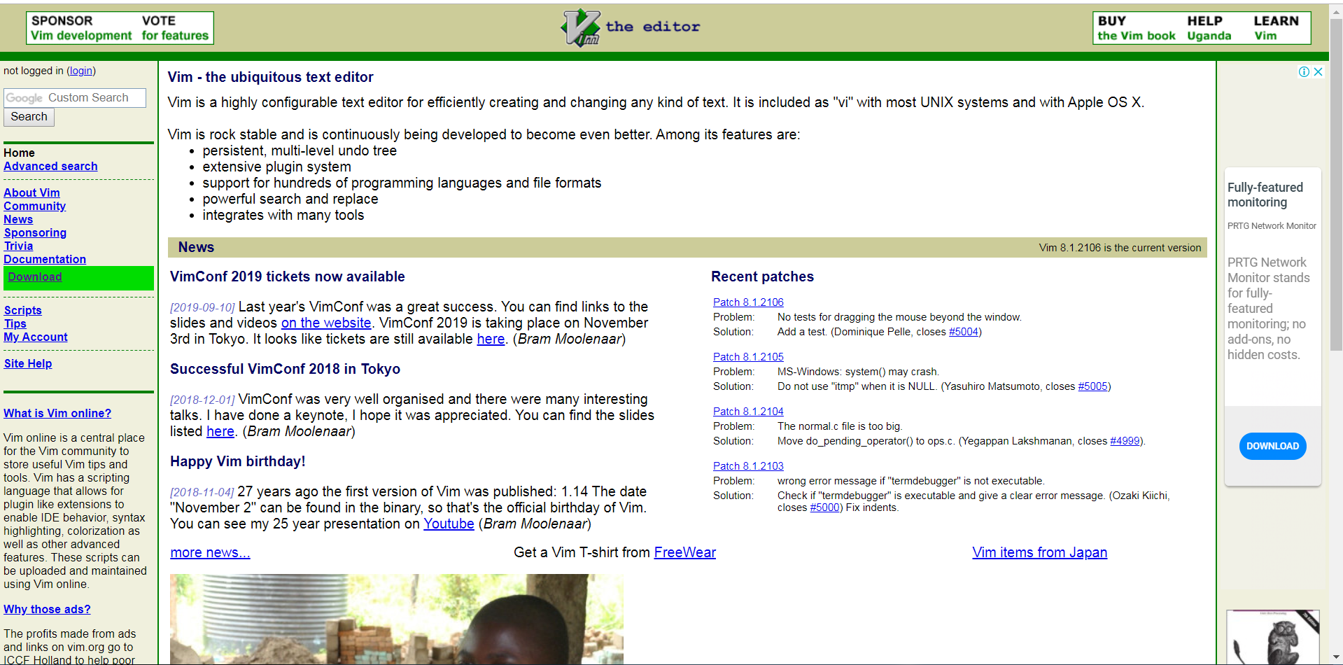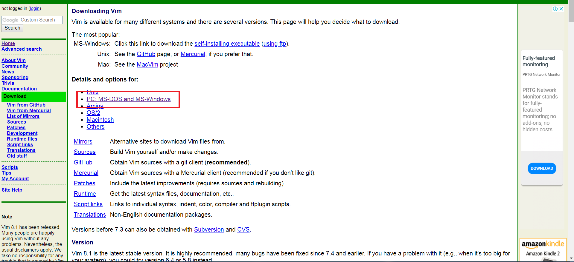 Window OS에서도 VIM을 설치해서 사용할 수 있다. 왼쪽 다운로드란으로 들어가면 윈도우용 설치파일을 받을 수 있다. 하드웨어 스펙에 맞게 다운로드를 받으면 된다