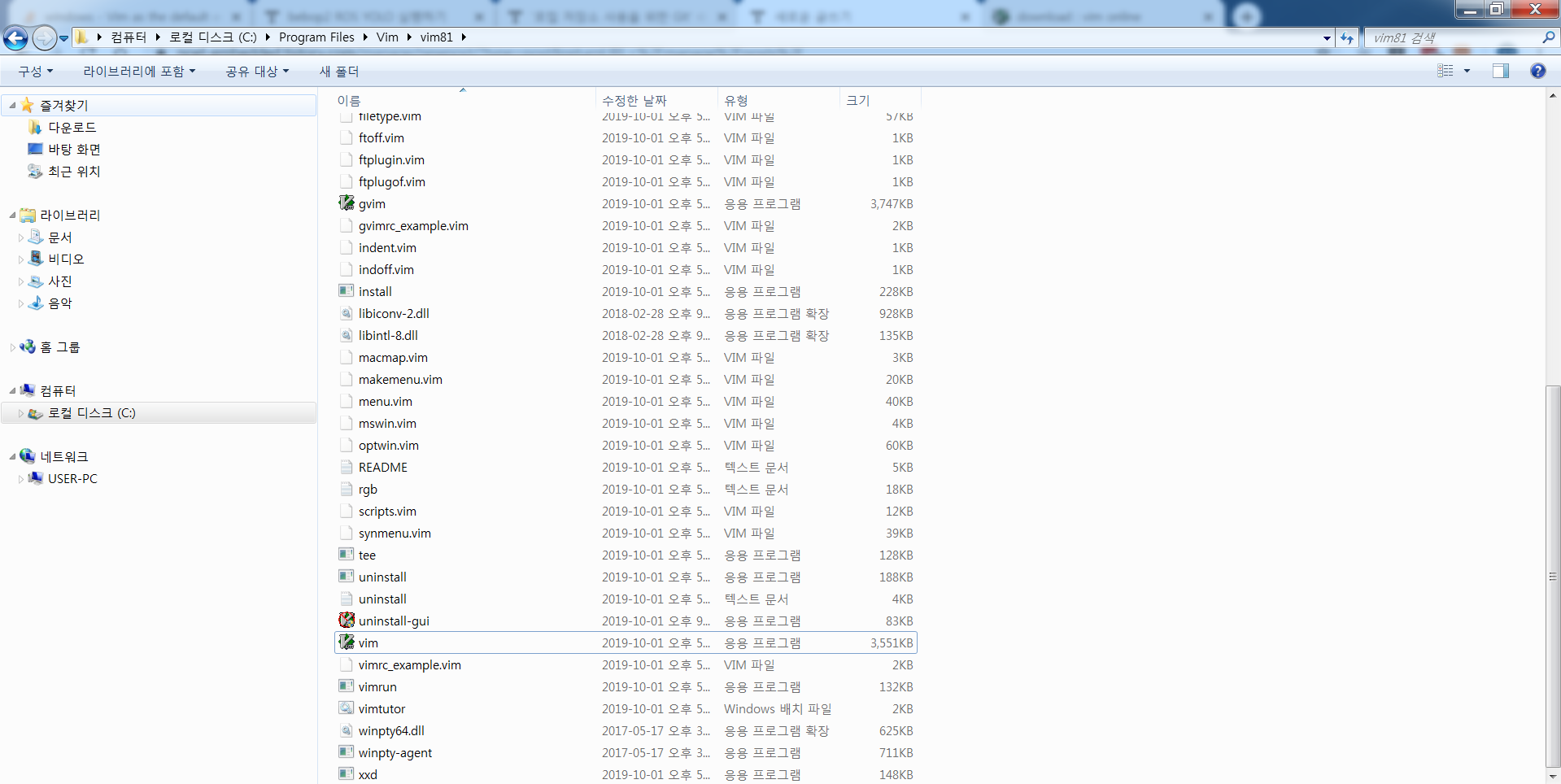 설치과정에서 등록된 경로를 기억한다. 필자의 경로는 C:\Program Files\Vim\vim81로 잡힌다. 다음과 같이 vim, gvim 등 실행파일이 있는 것을 확인할 수 있다