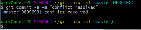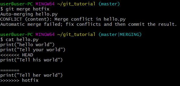 변경된 내용을 살펴보면, 충돌이 발생한 부분의 시작을 <<<<<<< HEAD, 충돌 난 부분의 끝을 >>>>>>> hotfix로 표시한다. 그리고 ====== 표시로 구분을 지어준다. 이 부분을 어떻게 수정할지는 사용자에게 전적으로 일임한다. 따라서 두 브랜치 중 하나의 내용을 선택하거나 두 수정내역을 적절하게 합치는 등 수동으로 해결해야 한다