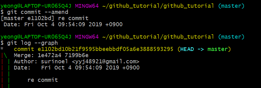 내용을 수정한 후 해당 명령을 실행하면 전에 commit 메세지를 담은 커밋은 re commit 메세지를 담은 커밋으로 덮어씌워지게 된다