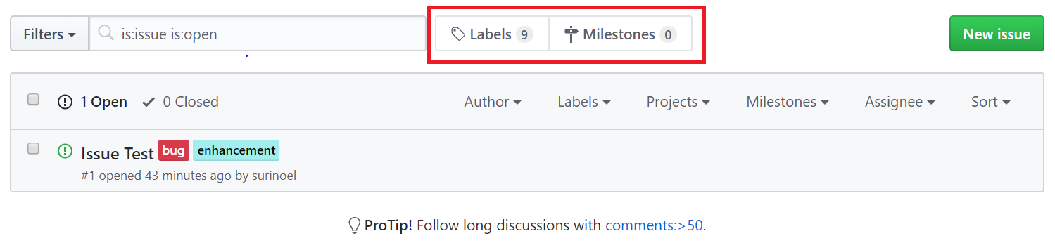 이슈 탭으로 들어가 새로운 이슈를 작성할 수 있다. 또한 추후에 사용할 Label과 Milestones를 새로 생성할 수 있다