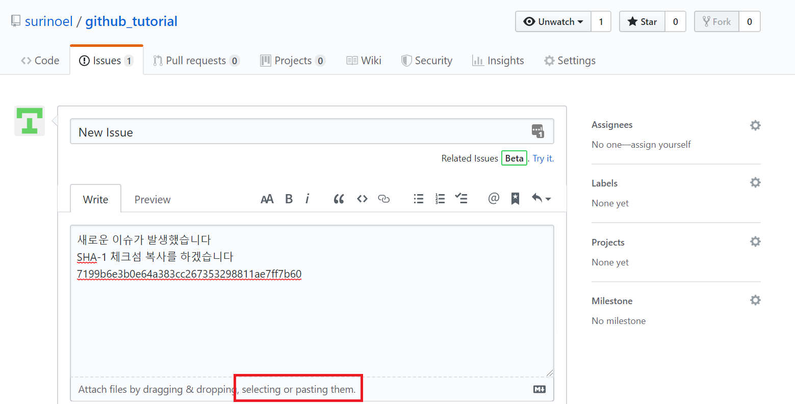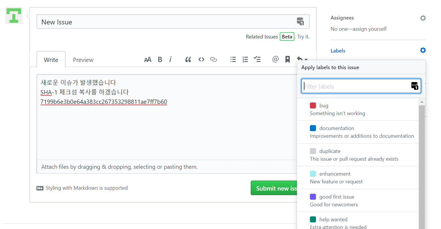 이슈 내용을 적는건 간단하다. 다음과 같이 Text로 작성할 수 있고, 궁금한 커밋에 대해서는 두번째 그림처럼 커밋으로 들어가 빨간색 네모칸을 눌러 SHA-1 체크섬을 복사해서 담을 수 있다. 혹은 첨부파일 혹은 드래그앤드롭으로도 옮길 수 있다