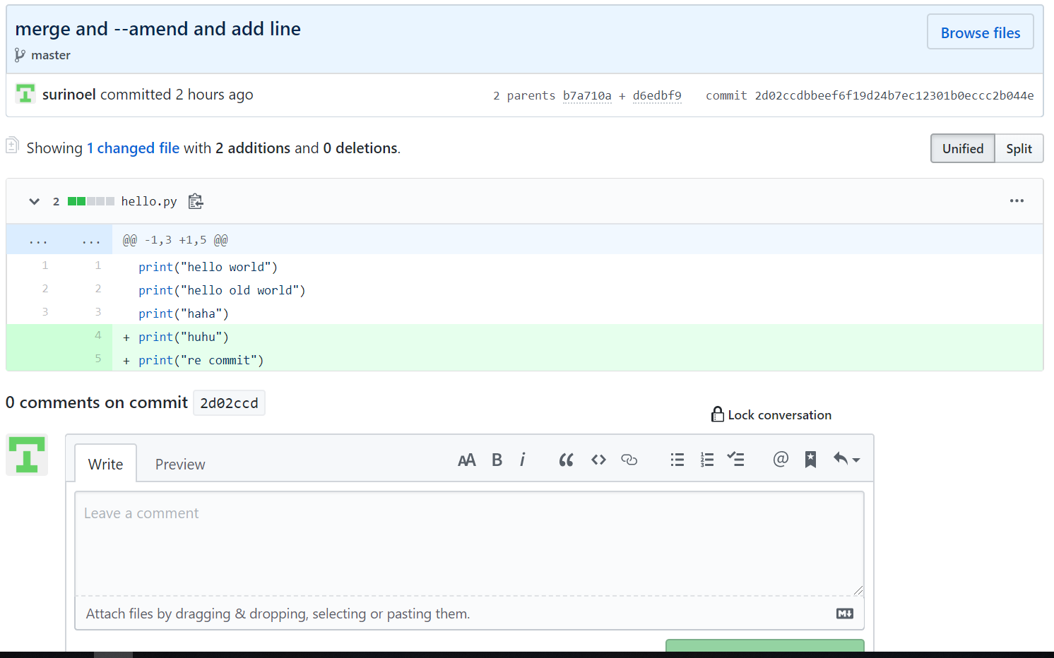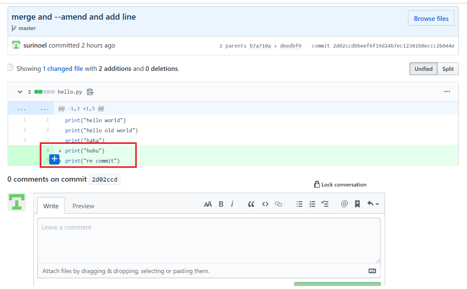 Github에서 커밋 혹은 병합 작업을 할 때의 코드리뷰 기능을 제공해주고 있다. 특정 커밋에 들어가면 다음과 같은 화면이 뜬다