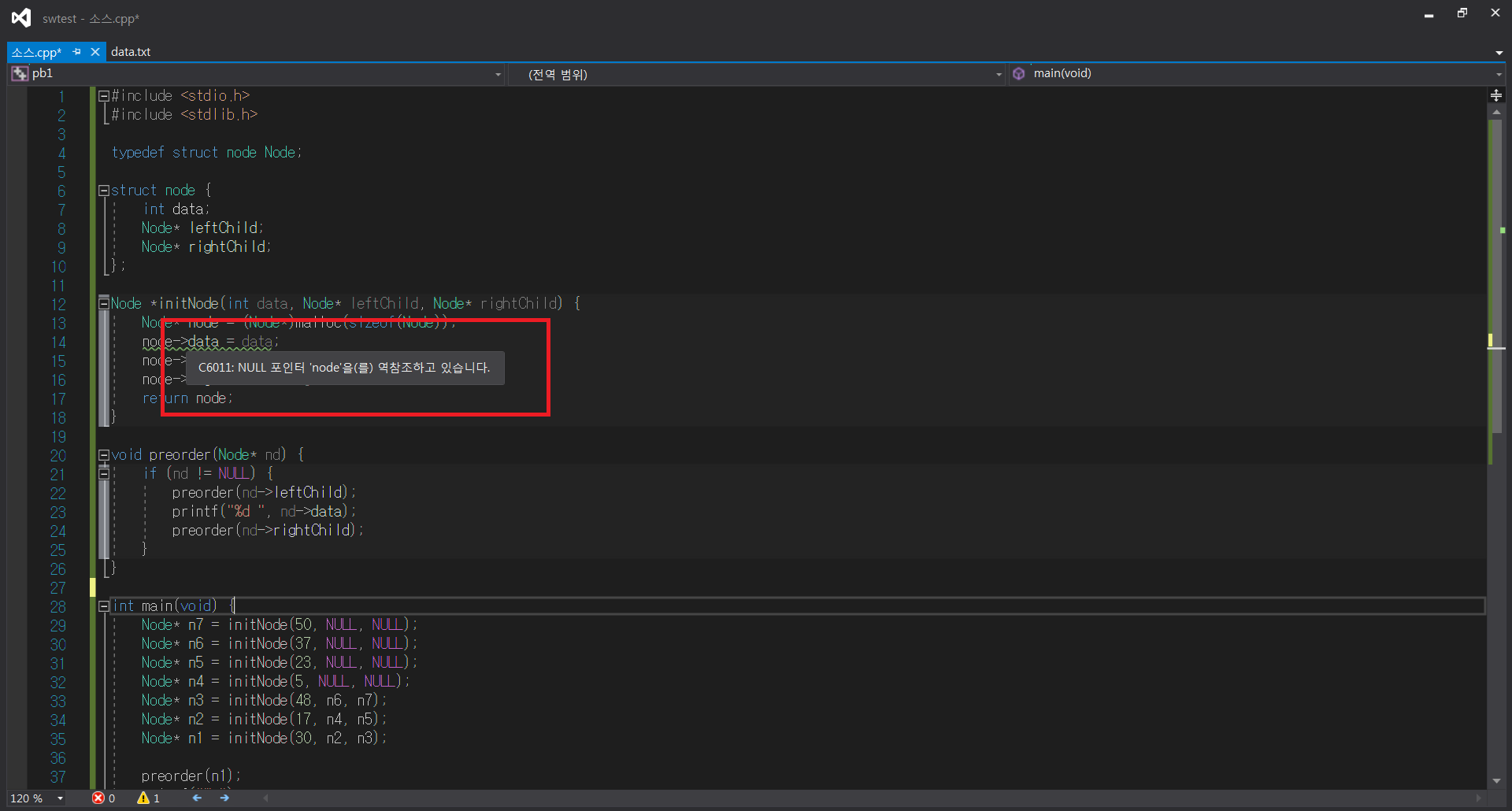 따라서 이를 방지하고자 visual studio에서 경고차원으로 넣은 것이다. 이를 해결하기 위해서는 node가 null인지 아닌지 검사하는 코드가 포함되어야만 한다