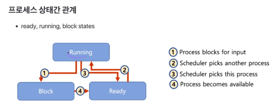 1. Running -> Block : 예를 들어 현재 실행 중인 프로세스가 '파일 읽기'를 요청했다면, 이 요청은 디스크에서 읽어오는 긴 과정이므로 block 상태로 빼게 된다. 만일 수행이 완료되었다는 이벤트가 발생하면 Ready 상태로 전환된다
