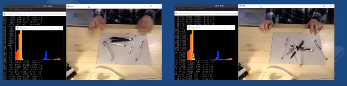 펜이 나열 되어있는 사진에 대한 히스토그램이 왼쪽에 표시되어 있다. 오른쪽은 펜의 나열을 달리 한 것이다. 중요한 것은 히스토그램은 불변한다는 특징이 있다. 이러한 특징을 이용해서 학습을 시키는 데 유용하게 사용할 수 있다