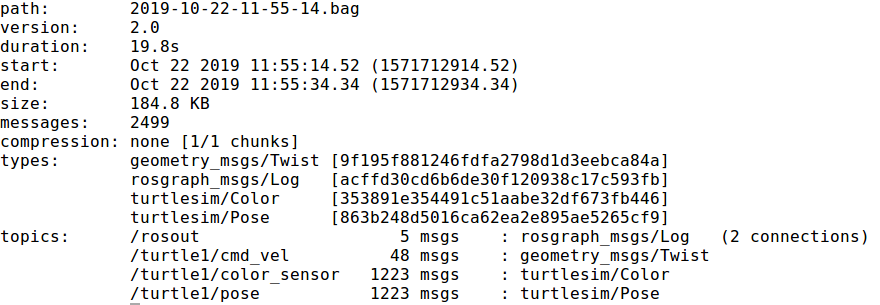 rosbag info 명령으로 기록 파일의 내용을 확인할 수 있다