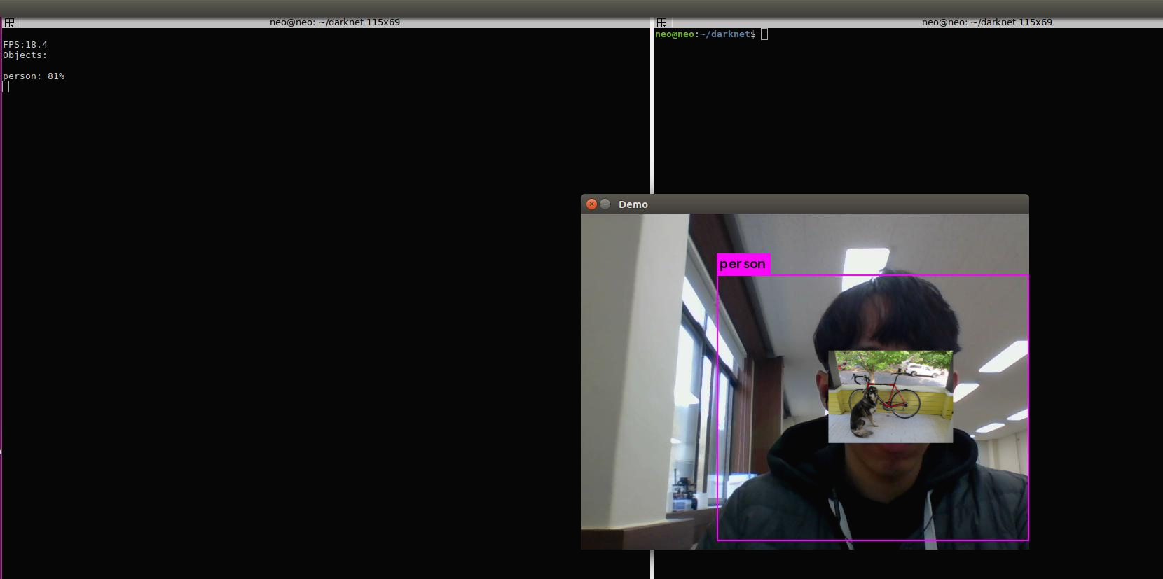 $ ./darknet detector demo cfg/coco.data cfg/yolov3-tiny.cfg cfg/yolov3-tiny.weights