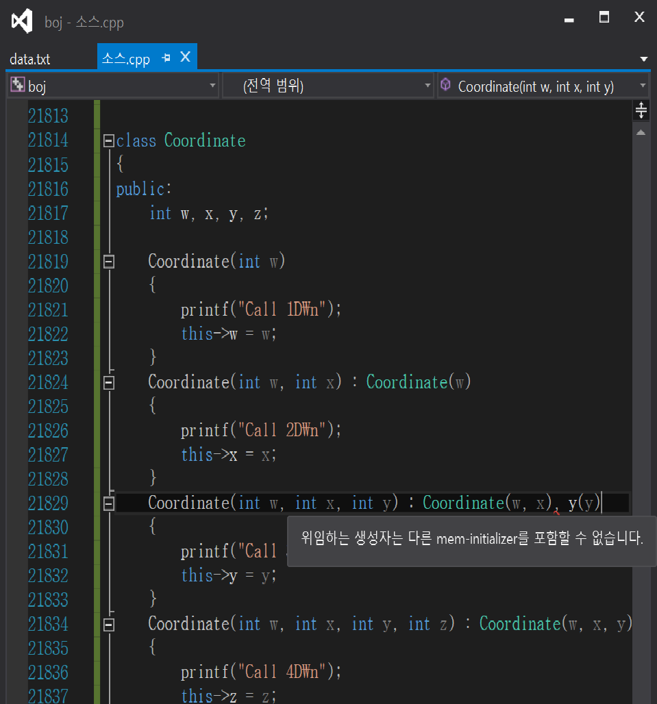 다만 위임 생성자로 초기화를 한다면, 다른 변수에 대해서는 initialize member를 사용할 수 없다. 따라서 중괄호 내부에서 this를 사용해서 초기화를 마쳐야만 한다
