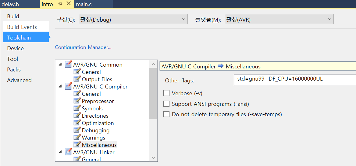 2. atmelstudio->alt+F7->toolchain->miscellaneous에서 other flag에 -DF_CPU=보드클럭을 추가할 수 있다