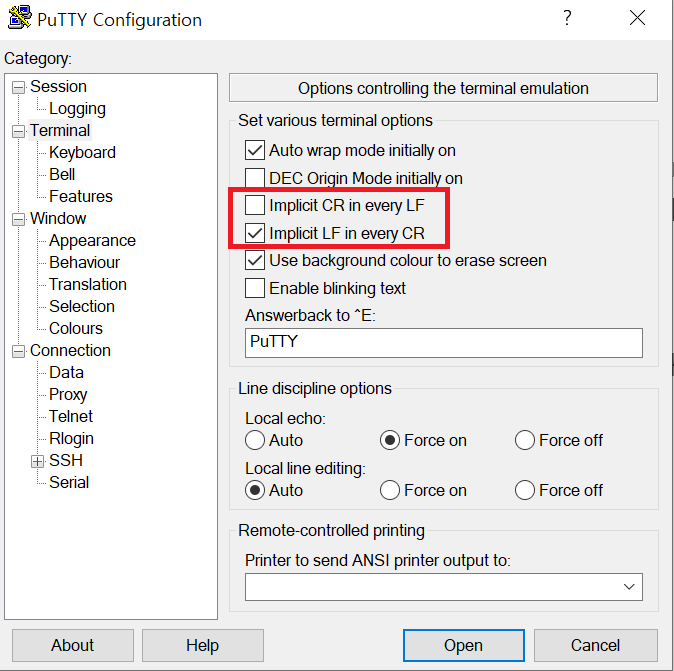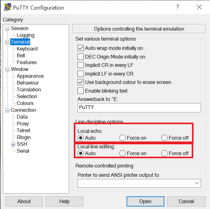 1. Local echo을 auto로 설정하면 putty에서 보내는 데이터가 가긴 가지만 사용자가 볼 수는 없다. 따라서 실수로 다른 문자를 입력할 수도 있으니 Force on으로 설정하는 것이 좋다. 하지만 보낸 것을 컨트롤러에서 다시 보낸다면 중복되니 상황에 맞게 설정해주면 좋을 것 같다