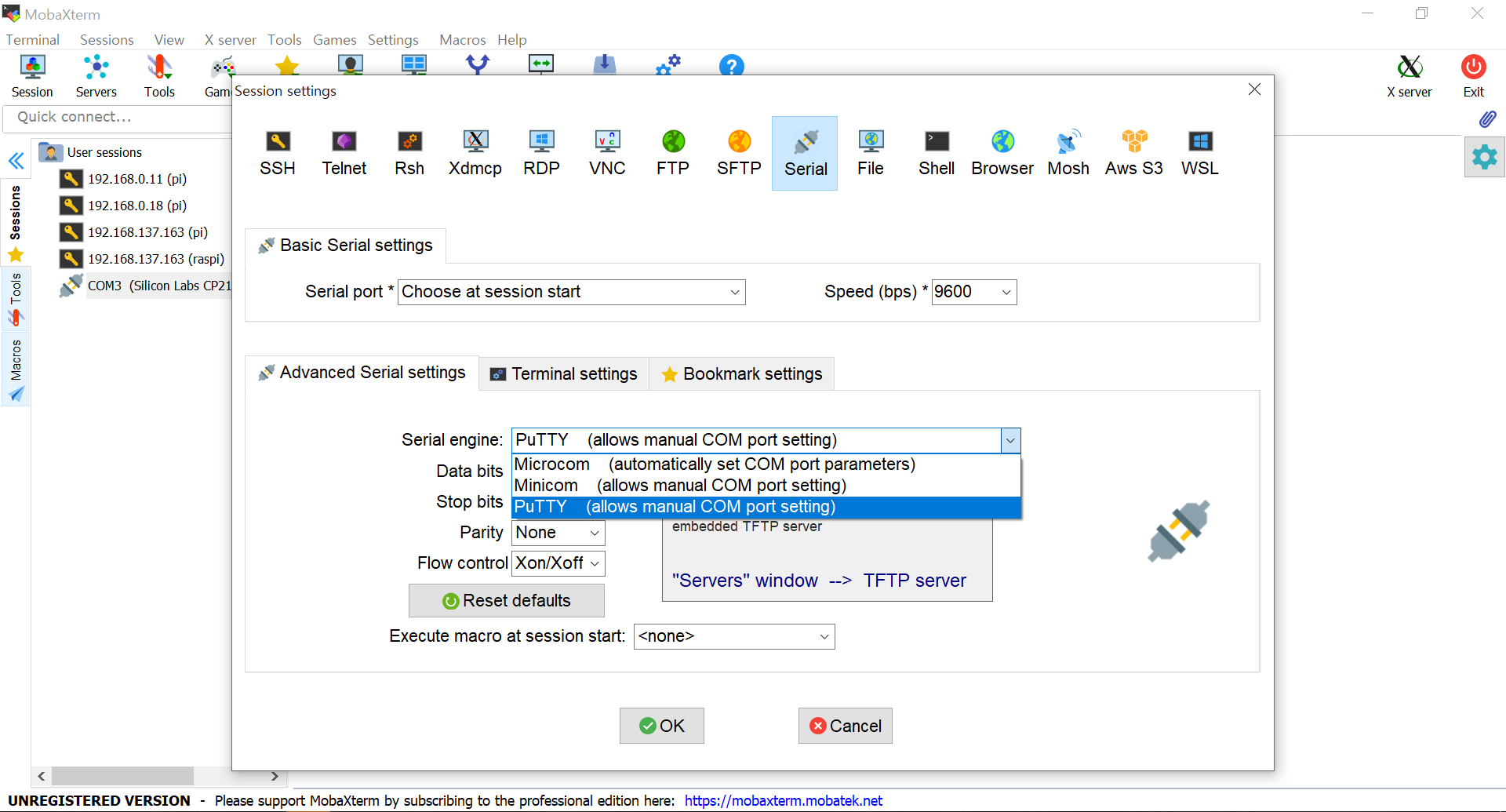 mobaxterm은 3가지 Serial Engine을 가지고 있다. 각각 엔진의 차이는 오픈소스로 배급되는 형태라 현재로썬 내 수준에서는 알 수가 없다. 다만 각각의 ui나 프로그램 크기에는 분명한 차이가 있지만 시리얼 통신에 한해서 프로토콜이 다르다고는 생각이 들지 않는다. 결론적으로는 3분은 microcom이나 혹은 minicom으로만 동작시켜야지 문제가 해결됐다.