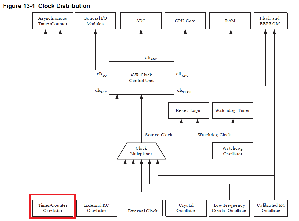 그러면 소수점까지 있는 정밀한 32.768KHz인 이유는 1초를 보다 정밀히 한다는 점을 주목하면 된다. 32768Hz을 128분주(실제 클럭이 128번 뛰면 카운터는 1번으로 인지)하면 256Hz가 나온다. 여기에 8비트 오버플로우 인터럽트를 사용하면 1초가 정확히 계산된다. 즉 (1/32768) * 128 * 256 = 1초가 계산된다.