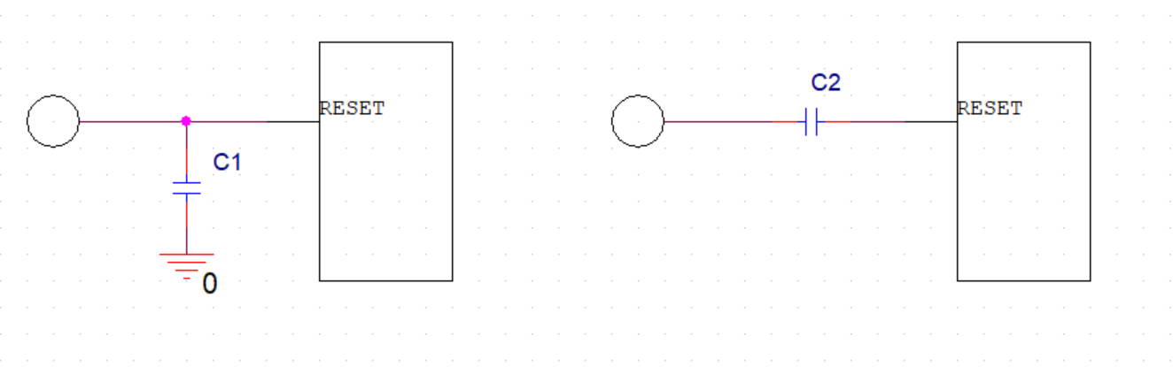 - 부트로더가 설치되었다고 한들 리셋회로의 하드웨어적인 뒷받침되어야 한다. 부트로더 지원 리셋회로는 ATmega128 보드와 커패시터를 연결하는 방법이 다르다. 아래 그림 중 왼쪽이 일반적인 노이즈 제거용 리셋회로이며, 오른쪽은 리셋 후 부트로더로 넘기게 하는 회로방식이다