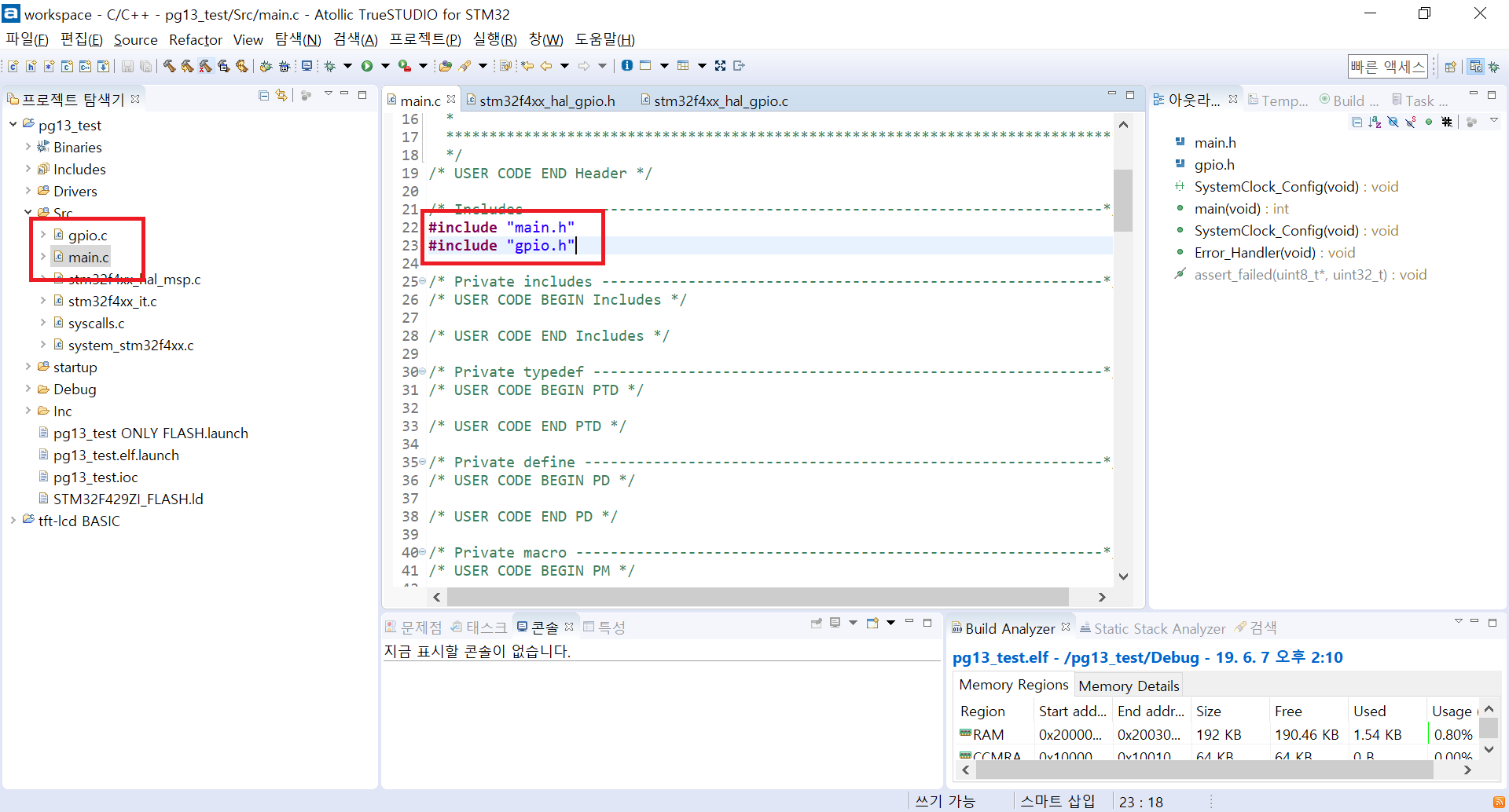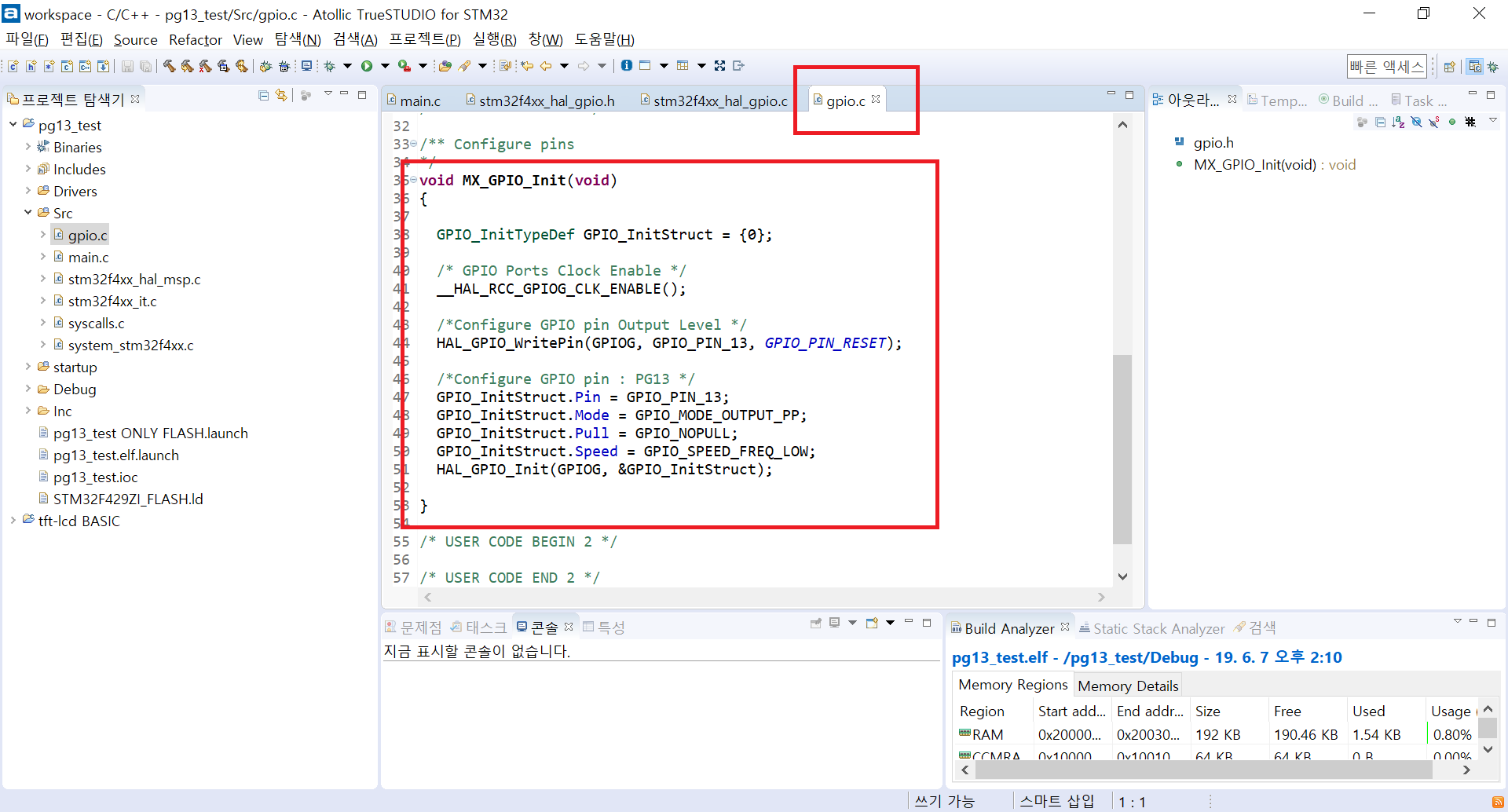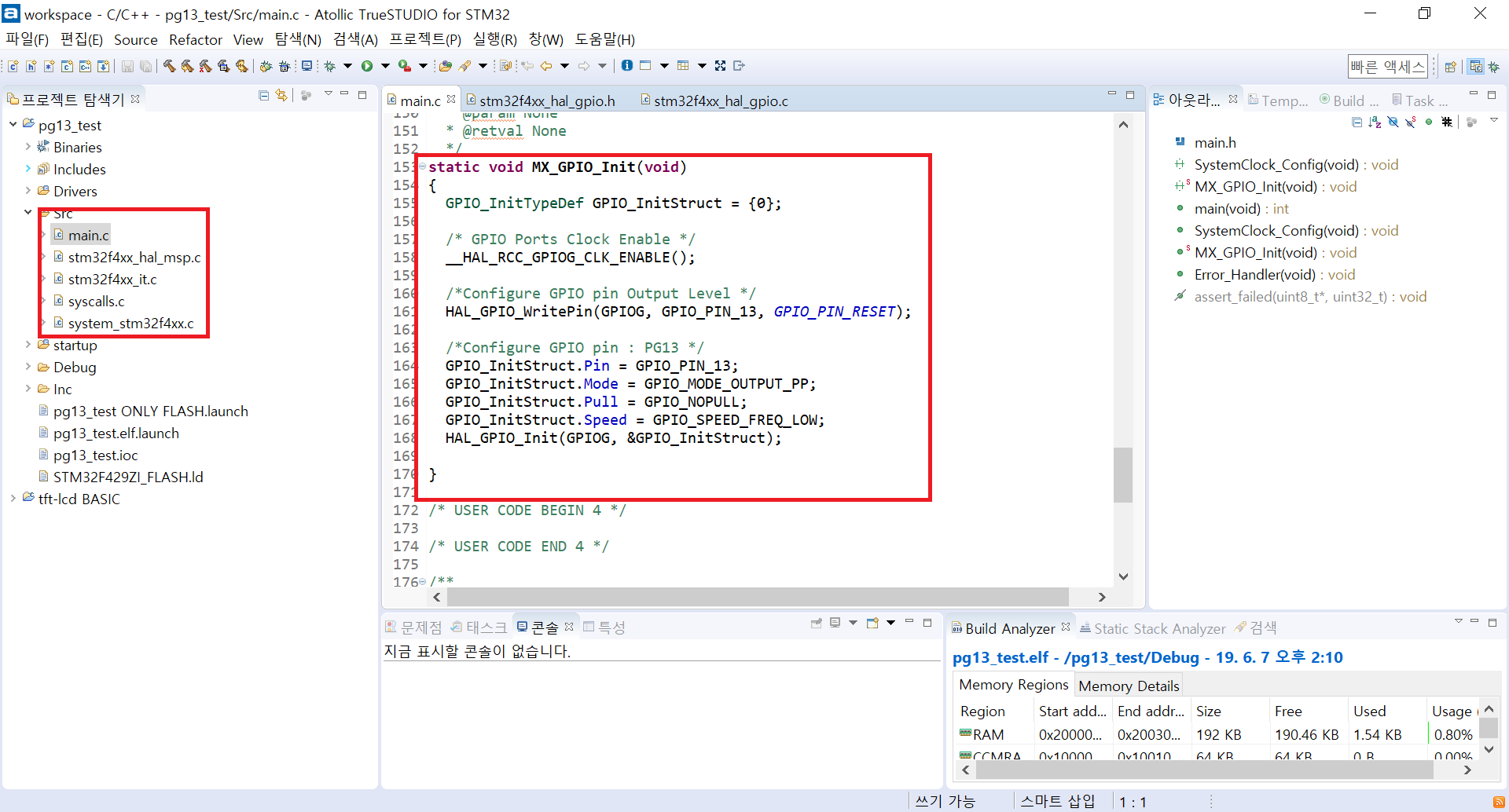 기존 디폴트 옵션인 해제했을 때의 truestudio 화면이다. 주목할 점은 빨간박스다. 다음 체크와 비교해보려고 한다. MX_GPIO_Init의 위치가 main.c 파일 하단에 위치해 있다