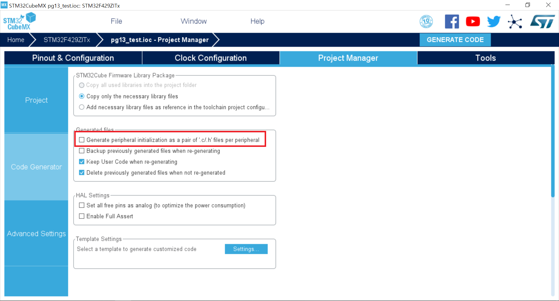 새로 생성된 파일인 gpio.c가 보이면서, main.c에서 새로운 헤더인 gpio.h를 include 했다. 그리고 위에서 봤던 MX_GPIO_Init은 main에서 사라져버렸다. 이제 대충 짐작을 하겠지만 저 옵션은 main에 모든 peripheral 함수를 넣을지 아닐지에 대해서 체크하는 것이다