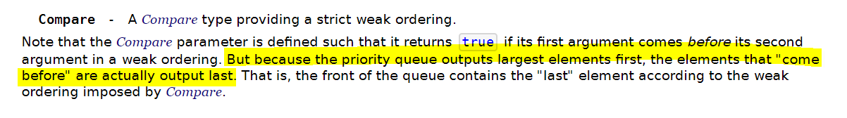 compare의 정의를 보면 우선순위 큐는 큰 것 부터 뽑아내기 때문에 실제 정렬을 이룬 후 맨 앞에 오는 요소는 실제로 마지막에 나오는 요소라고 되어있다