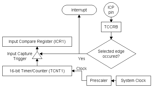 1. ICPn 핀을 통해 특정 사건이 발생하는 경우, TCNT 값을 저장하기 위한 ICRn 레지스터가 있다. TCCRnB 레지스터에 7번 ICNCn과 ICESn으로 enable할 수 있다. 1번 타이머의 경우 ICP 이외에 아날로그 비교기 결과를 input으로 사용할 수 있다