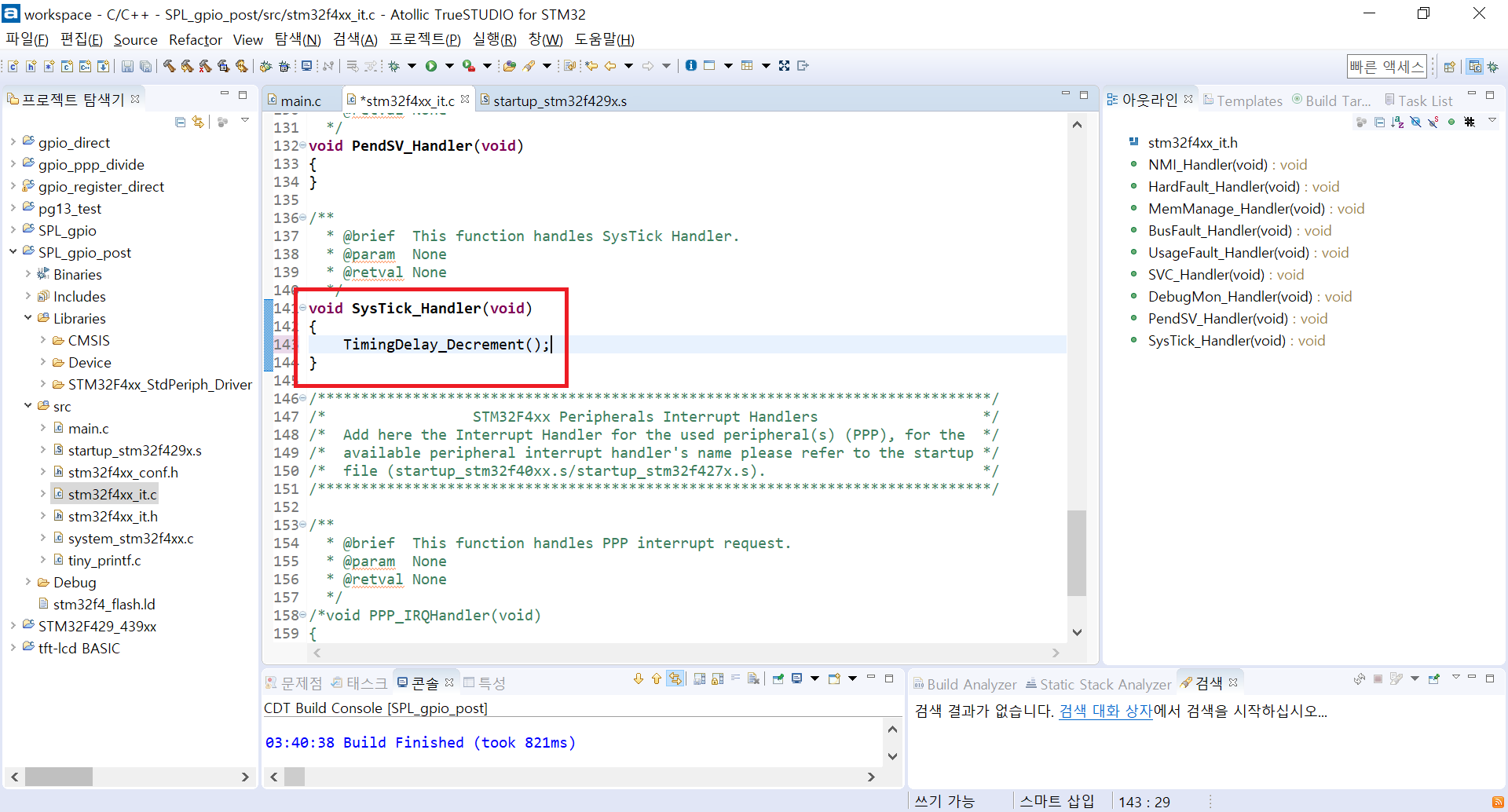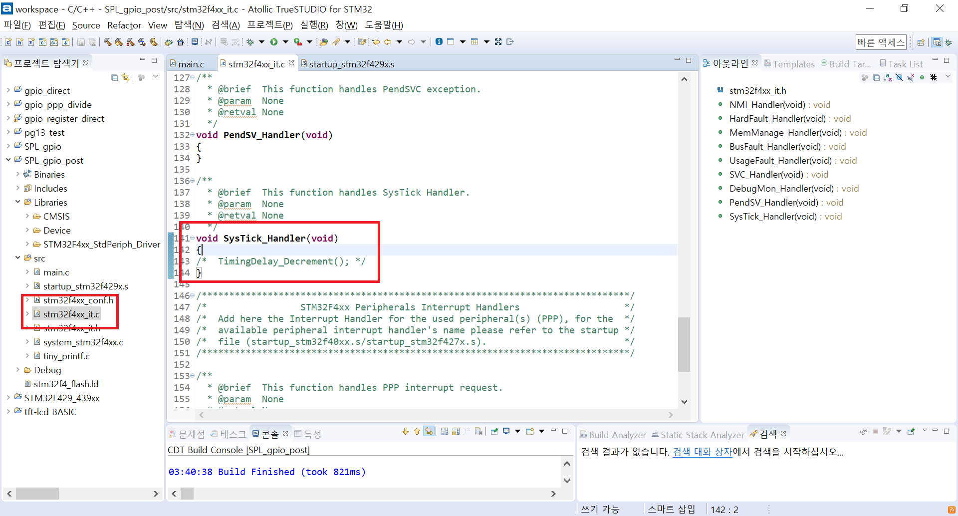 12. 그리고 한 번 stm32f4xx_it.c에 들어가서 SysTick_Handler를 보면 친절하게 TimingDelay_Decrement 함수가 보일 것이다. 주석을 해제해주자