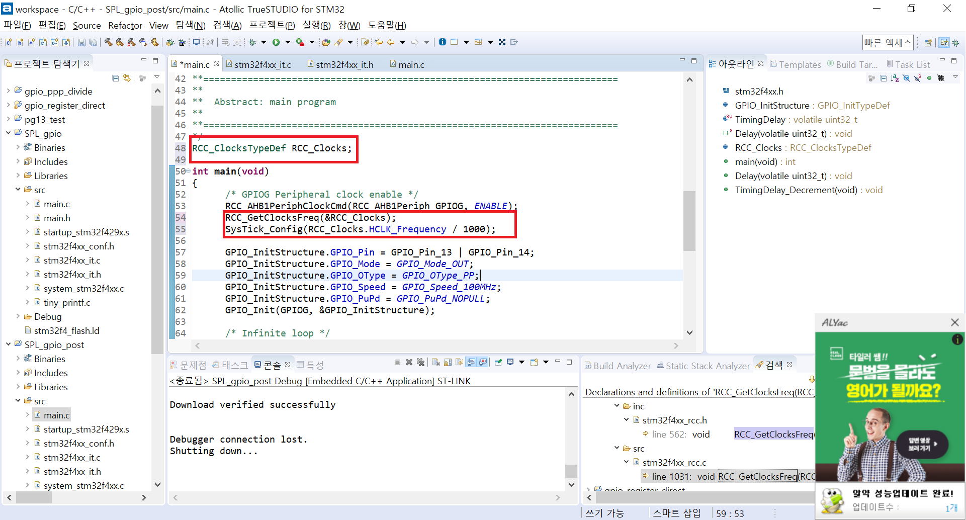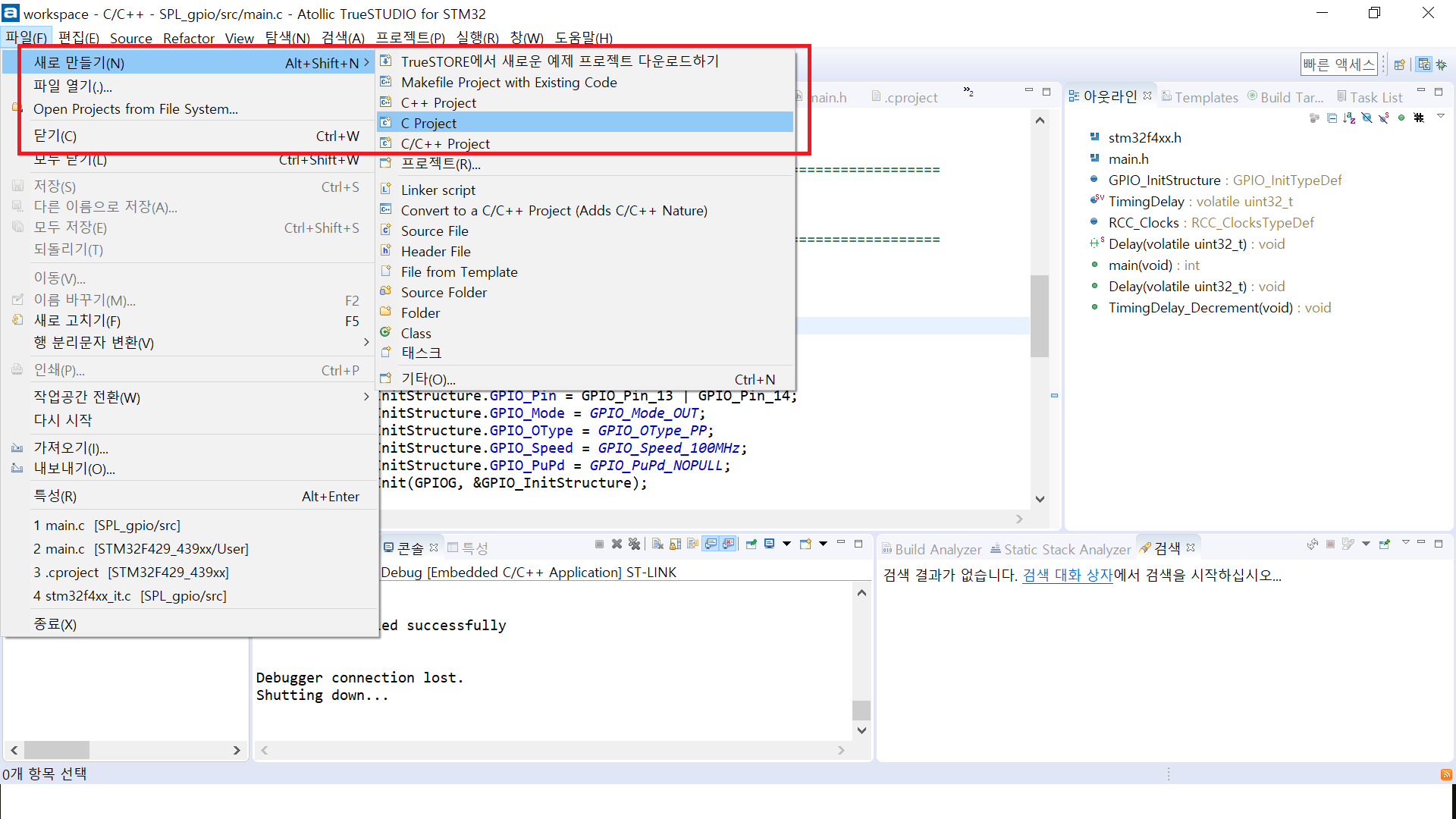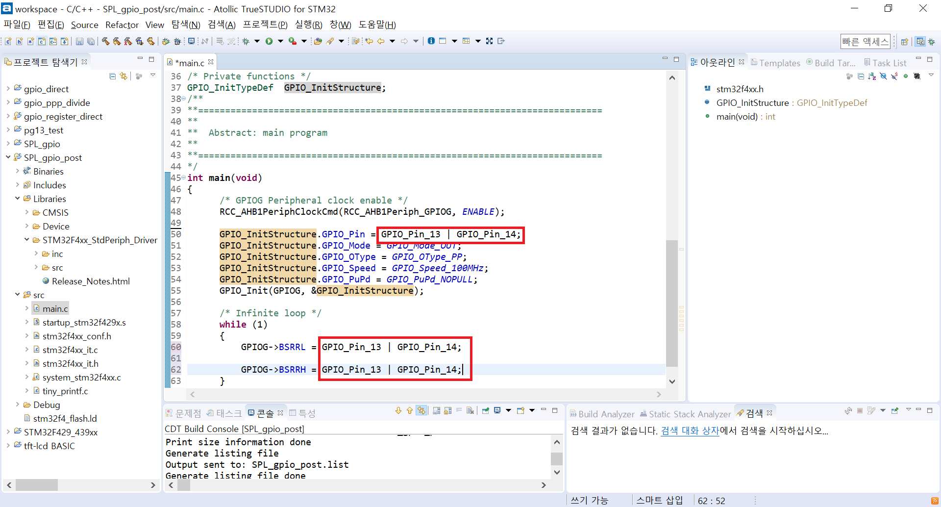 박스 친 것을 TrueSTUDIO에서 만든 프로젝트의 main.c에서 붙여넣기를 하자. 그리고 빌드를 한 번 해보자. 아마 잘 될 것이다