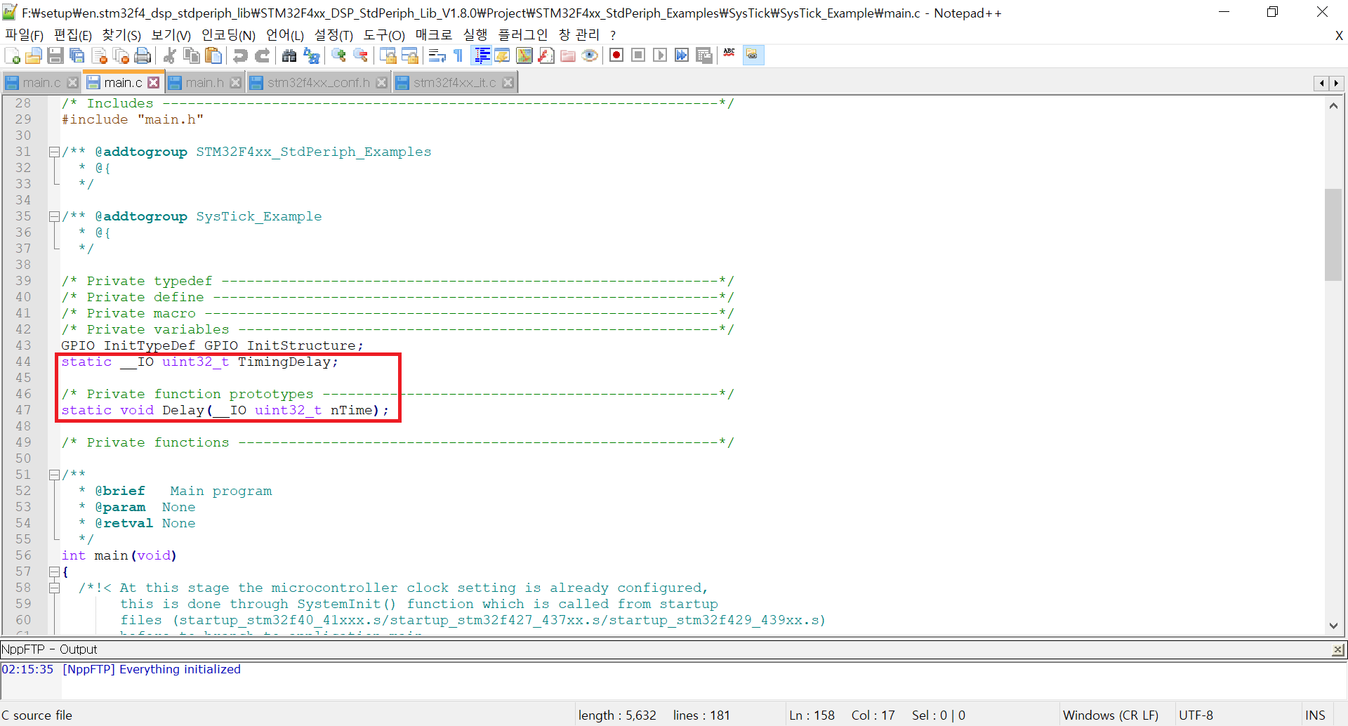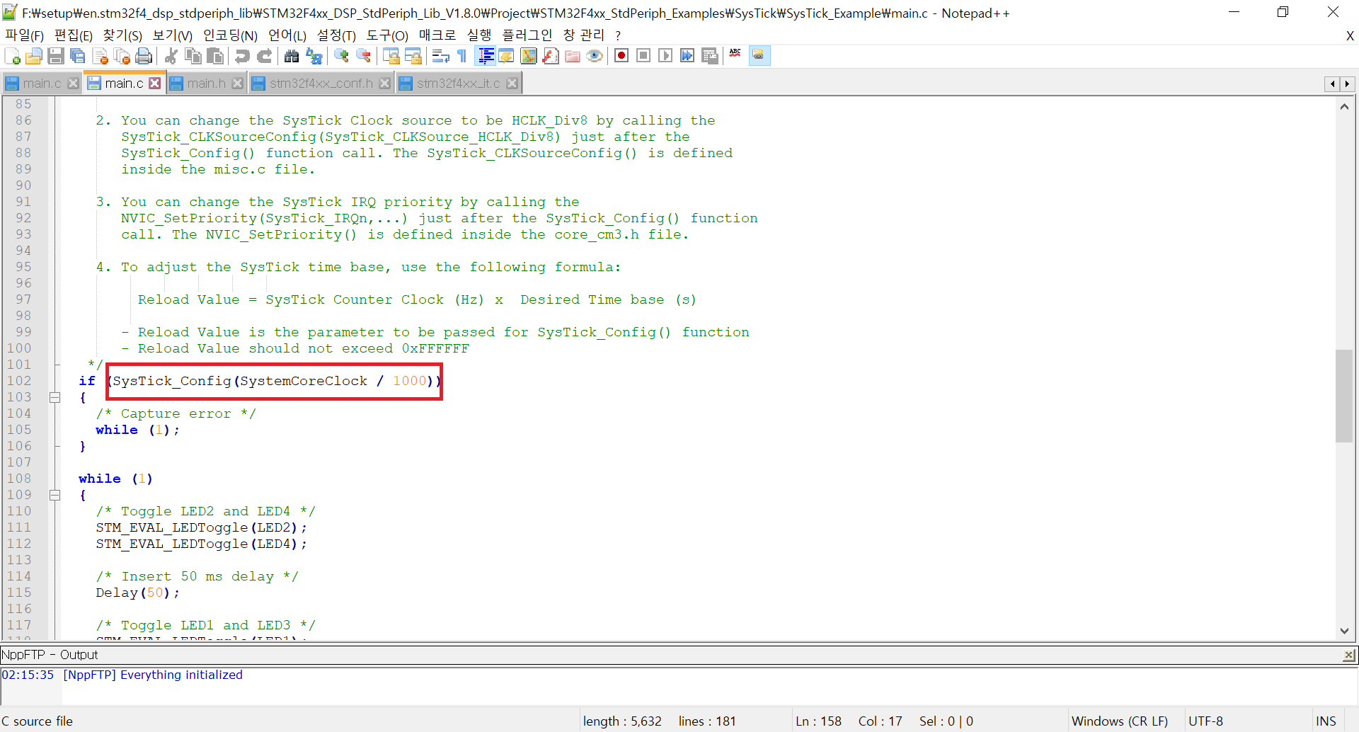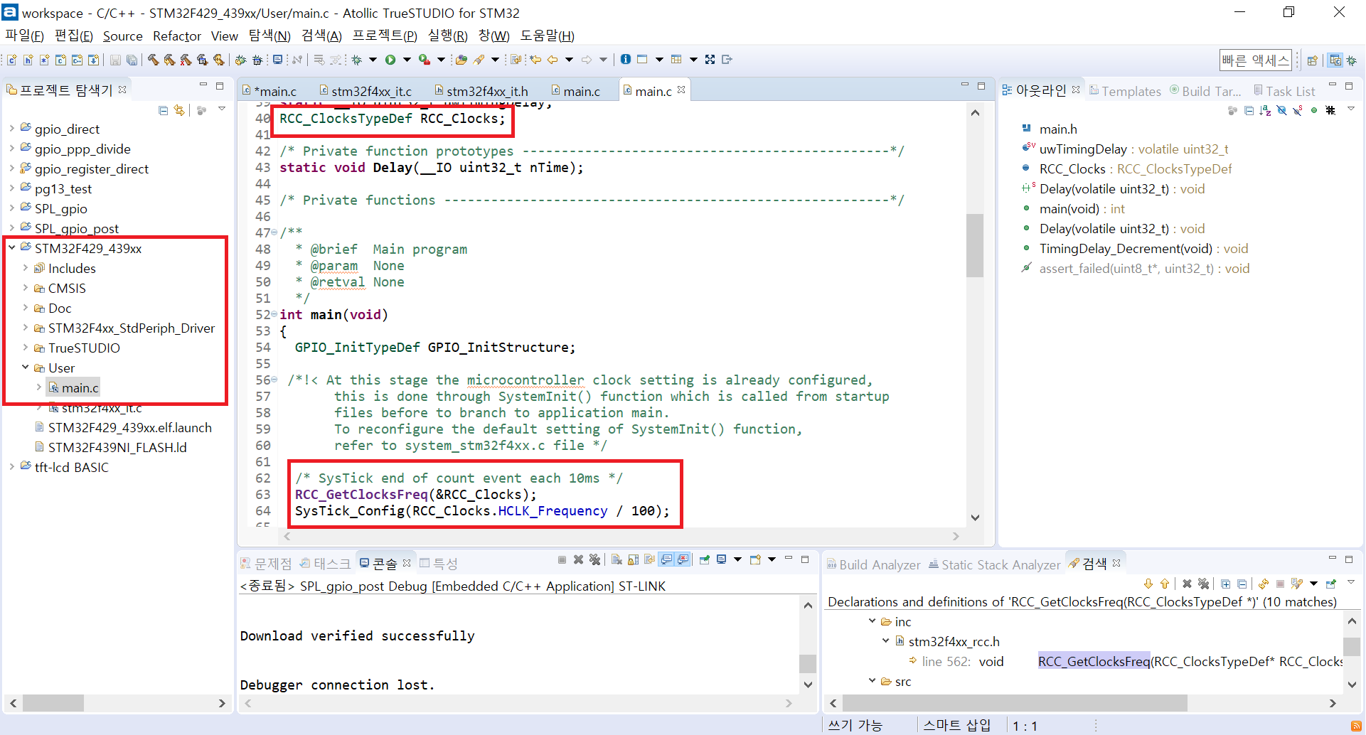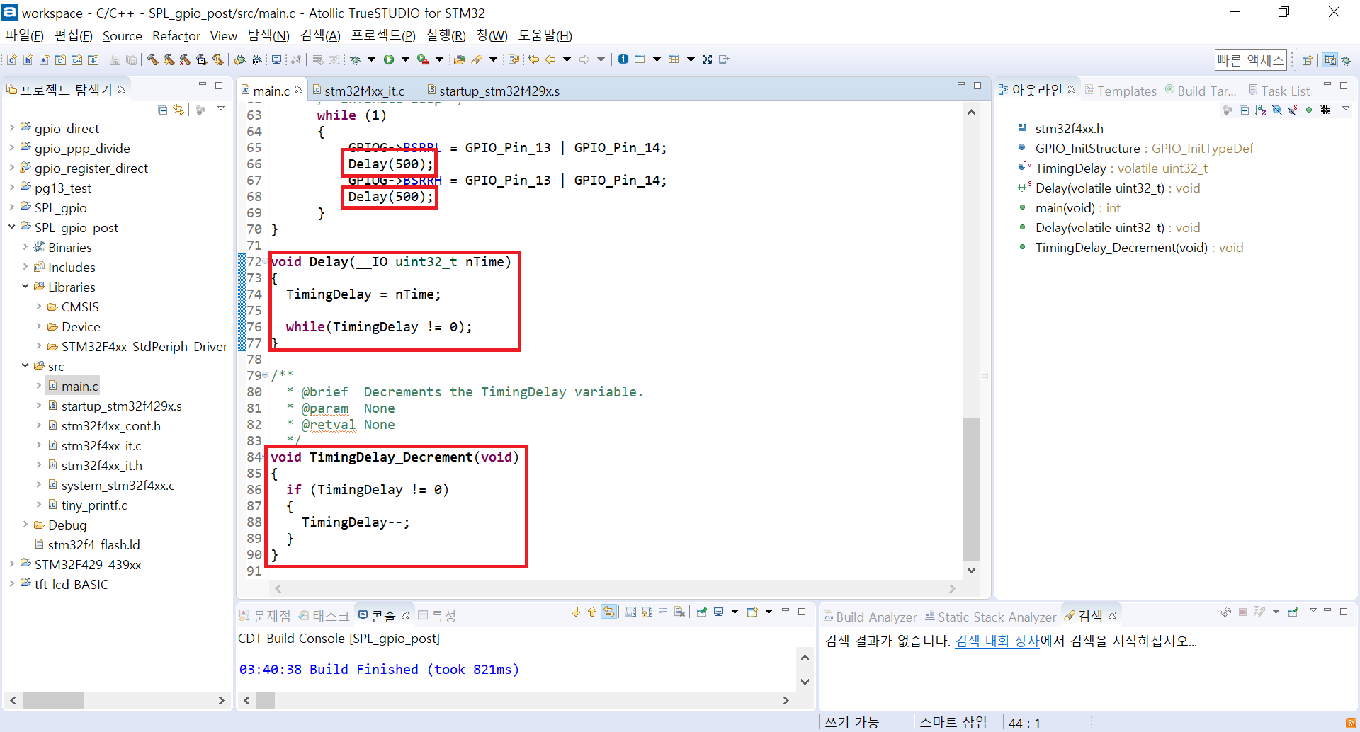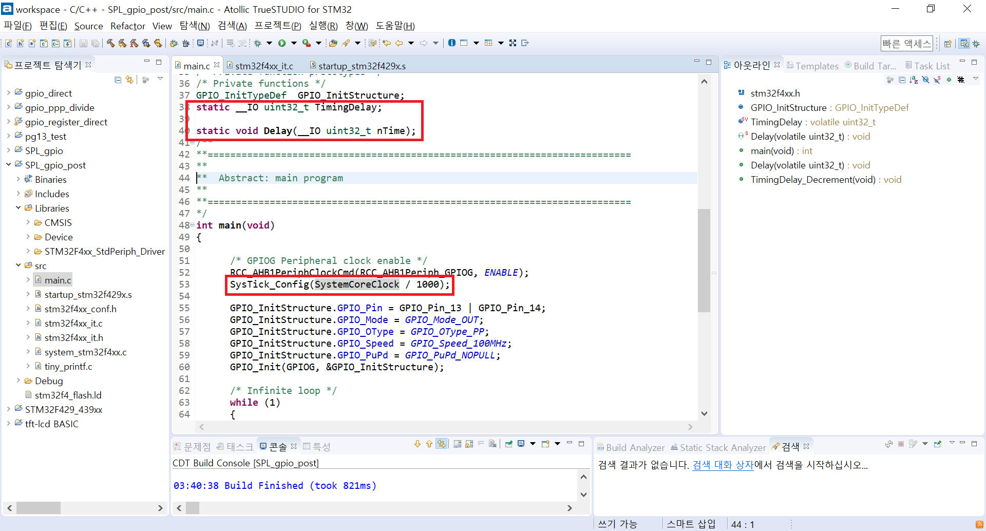 Delay 함수는 SysTick Handler에 의해서 카운팅이 된다는 점을 알아두자. 마찬가지로 바로 main.c를 보자