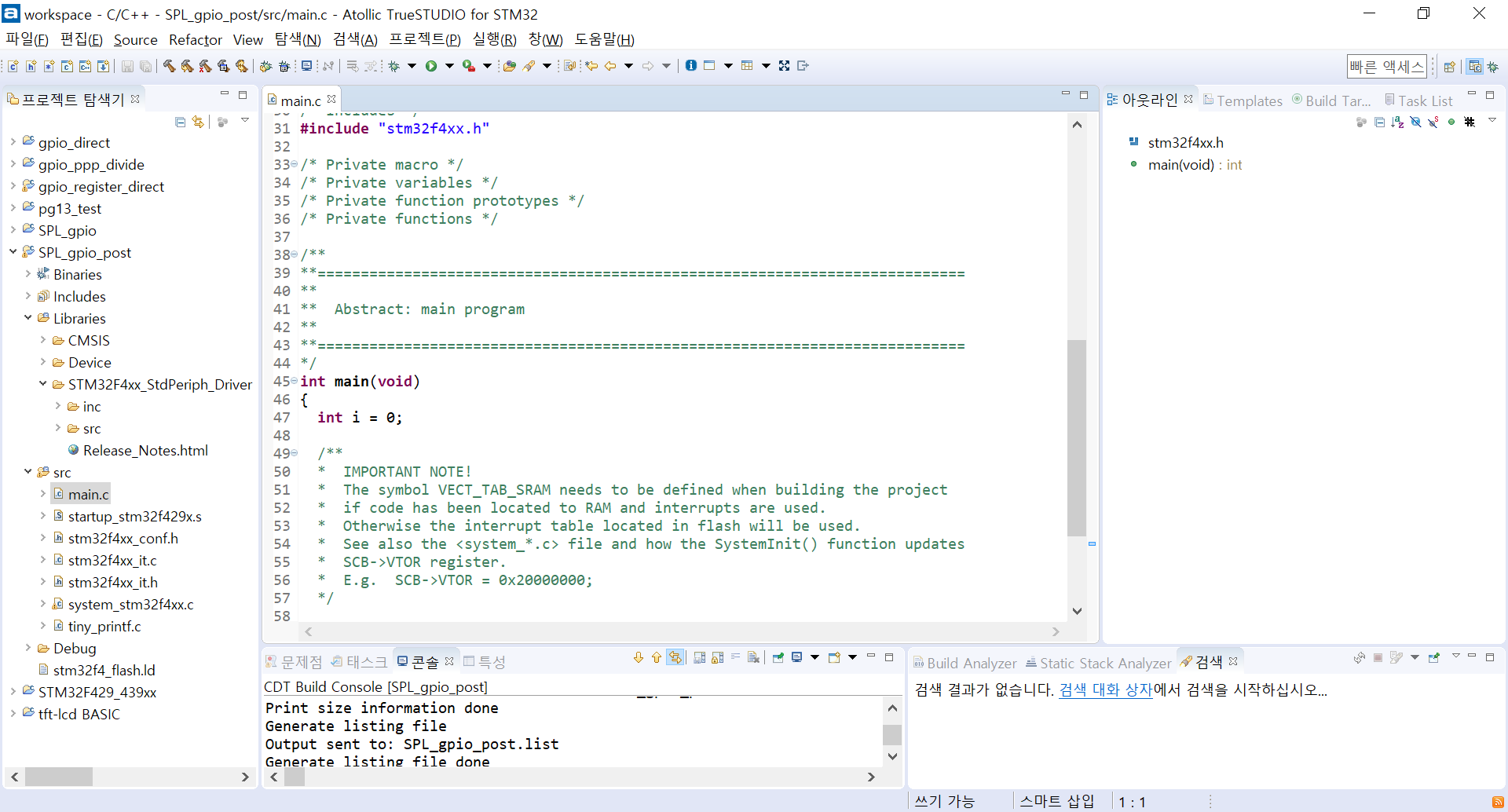 9. TrueSTUDIO에서 위와 같이 프로젝트를 만들면 SPL을 포함한 필요한 파일들을 자동적으로 만들어주기 때문에 편리하다. 물론 펌웨어 구조와 분리된 파일들의 역할이 중요하지만 일단은 속성이기에 넘어간다. 하지만 main을 보면 허무하기 짝이없다