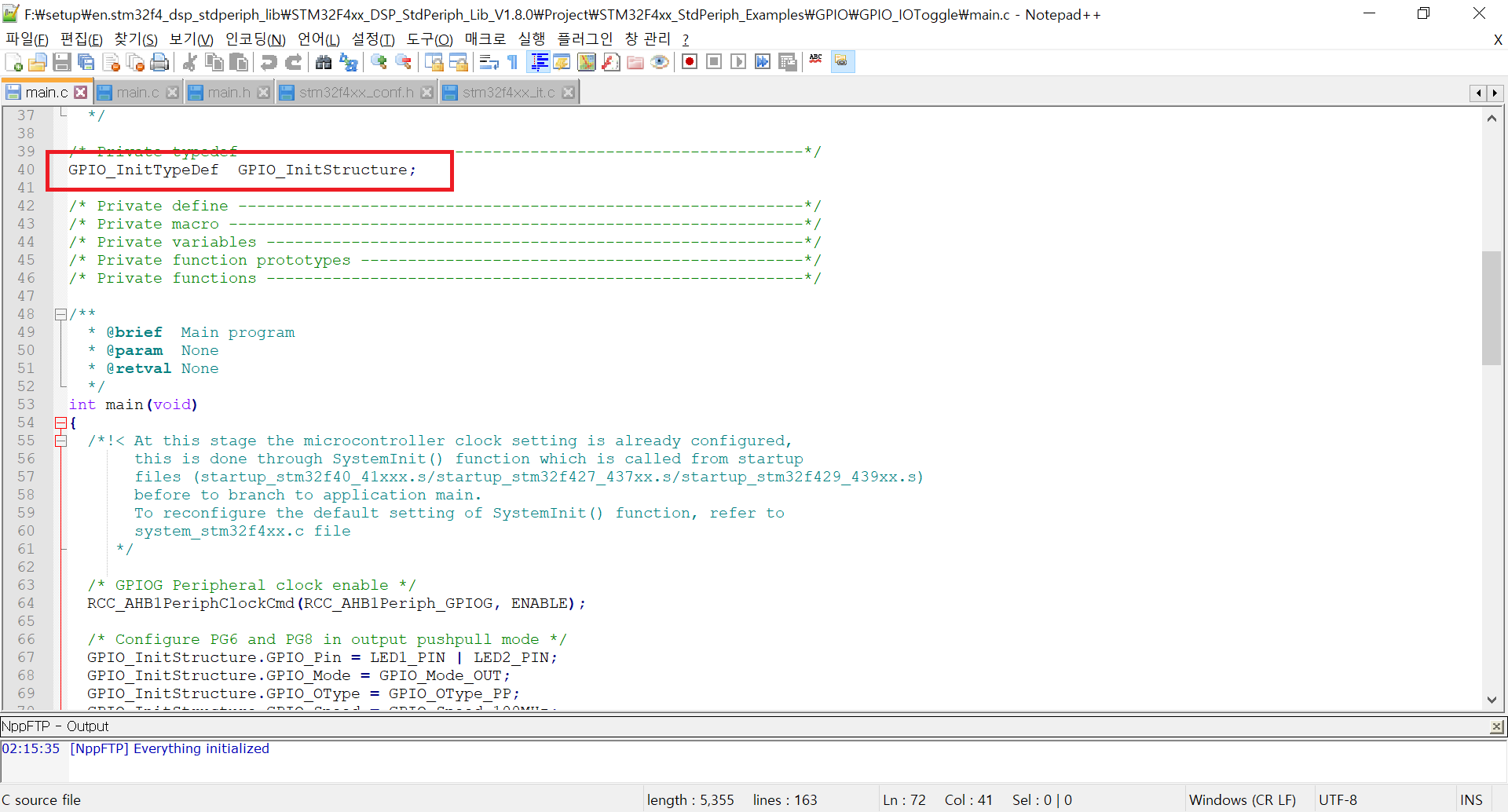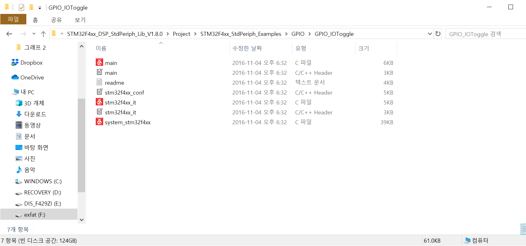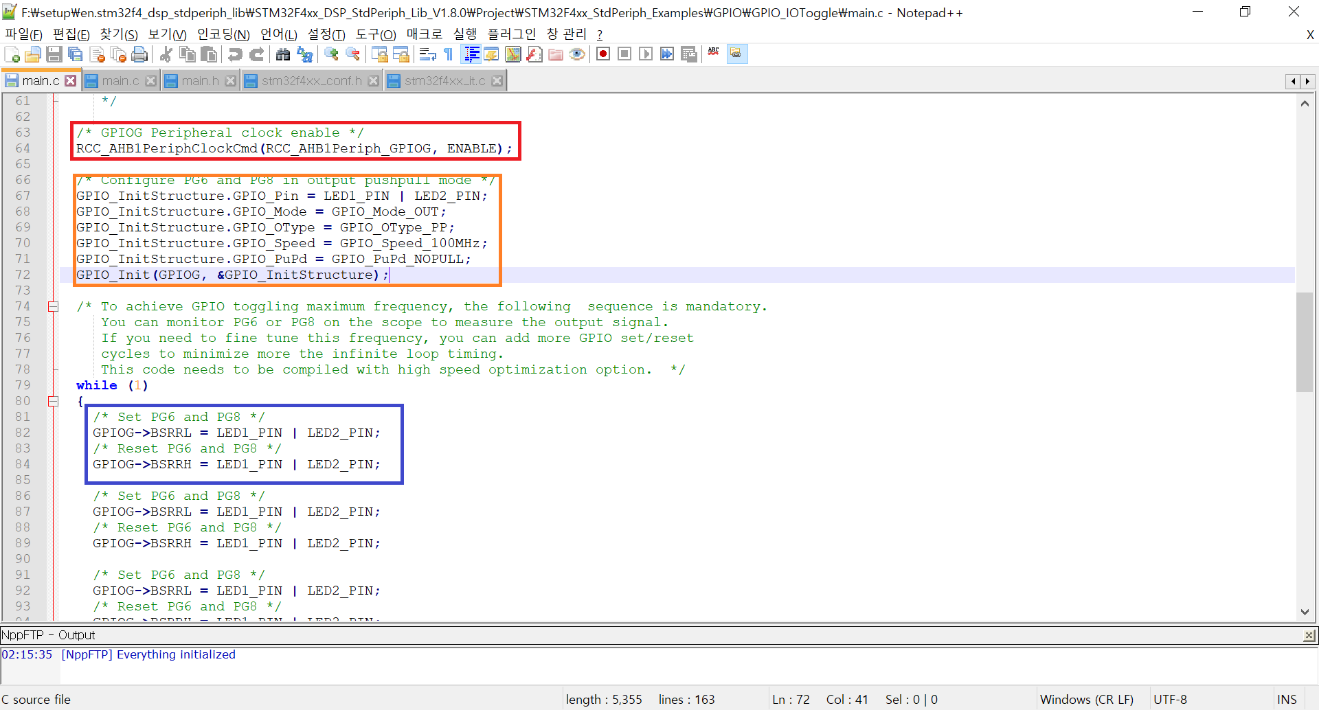10. 이를 위해 아까 다운받은 템플릿과 예제를 이용해야 한다. 먼저 STM32F4xx_DSP_StdPeriph_Lib_V1.8.0\Project\STM32F4xx_StdPeriph_Examples\GPIO\GPIO_IOToggle로 이동하자. GPIO에 대한 예제인데 main을 열어보기로 한다. 편의를 위해 notepad++로 열기로 하겠다