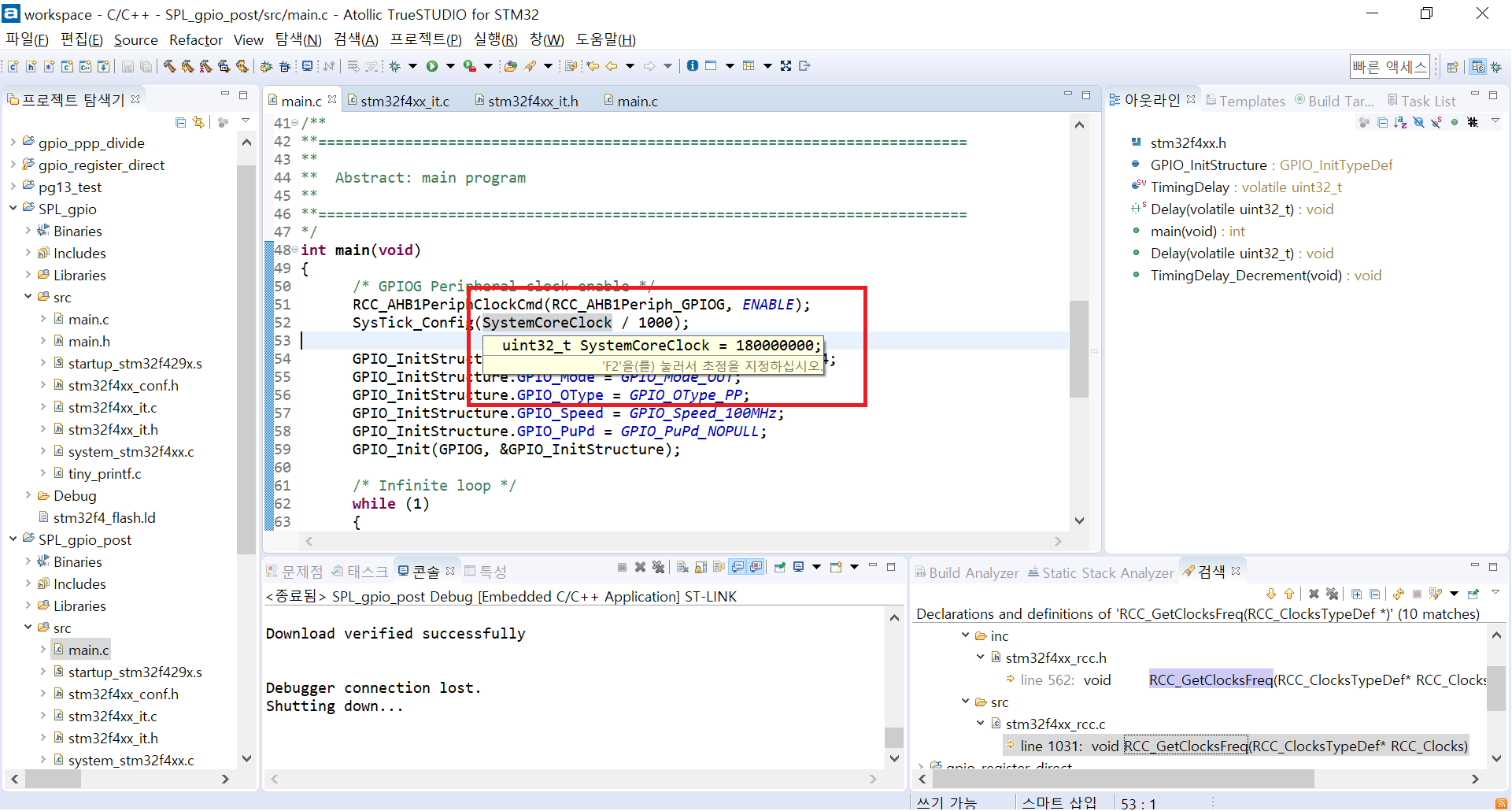 13. 빌드 후 디버깅을 해보면 Delay(500)이 0.5초와 맞지 않을 것이다. 그 이유는 SystemCoreClock이 최대 클럭이 180M로 설정되어 있기 때문이다