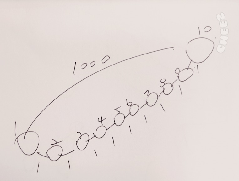 3. 정점과 정점사이의 최단거리 정점은 최대 V-2개만 허용하고 이를 잇는 최단거리 간선또한 V-1만 허용하게 된다. 따라서 두 정점 사이의 최대 V-1개의 간선을 조사해야므로 시간복잡도는 O(VE)가 된다