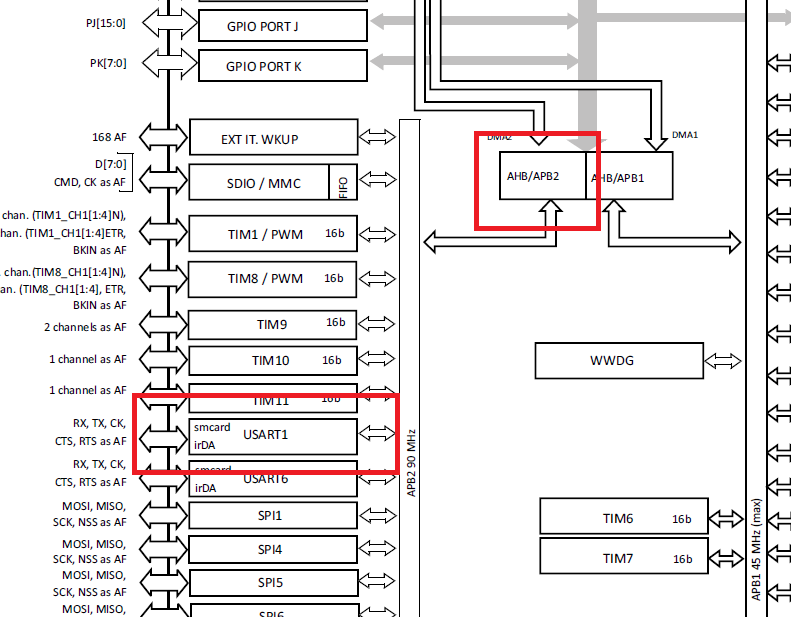 STM32F429XX 데이터시트를 참고하면, UART1은 APB2 버스에 연결되었음을 알 수 있고, APB2와 기존 LED를 사용하기 위해서 AHB1 클럭을 반드시 열어야만 한다
