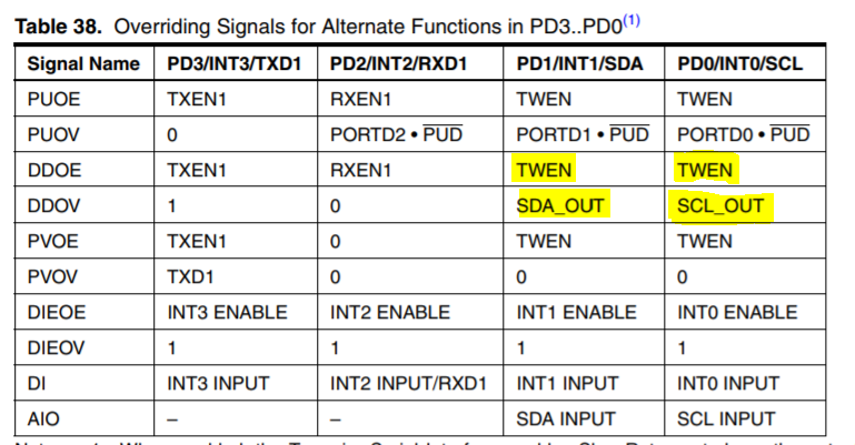 예를 들어 I2C에서는 PD0과 PD1을 각각 SCL과 SDA로 쓰고 싶다면 TWEN을 반드시 enable 해야된다