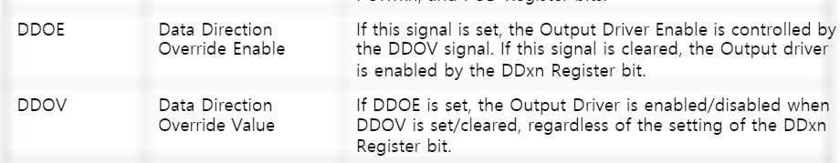 만일, DDOE가 set 된다면 Output Driver는 DDRx가 아닌 DDOV로 제어된다고 한다. 즉 DDOE가 set 된다면 DDRx의 의미는 사라지는 것이다(그 핀이 출력이었는지, 입력이었는지, 하지만 풀업 설정을 원한다면 반드시 이전에 해야한다. 참고로 풀업 enable 신호도 TWEN에 의해 시작된다)