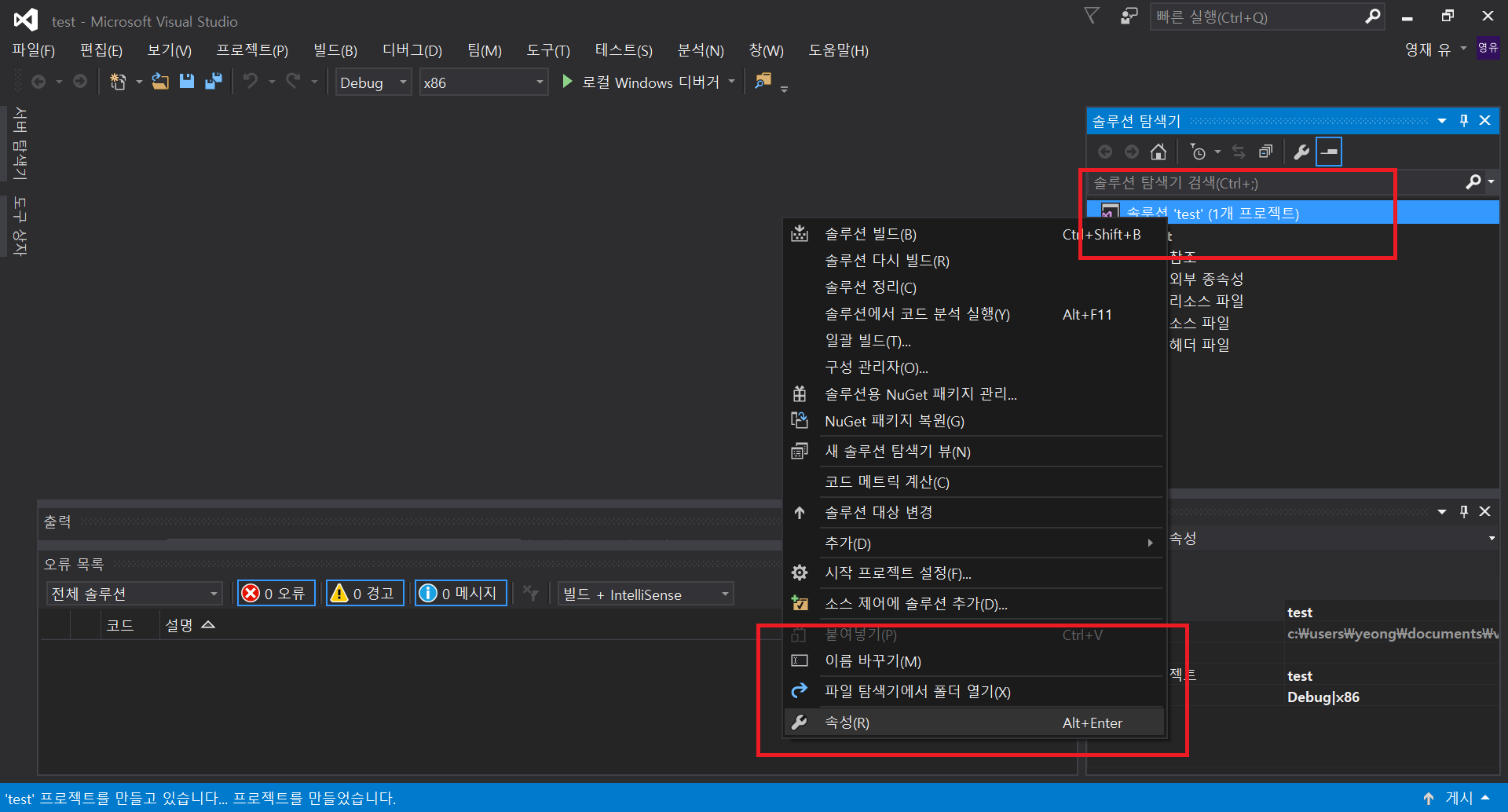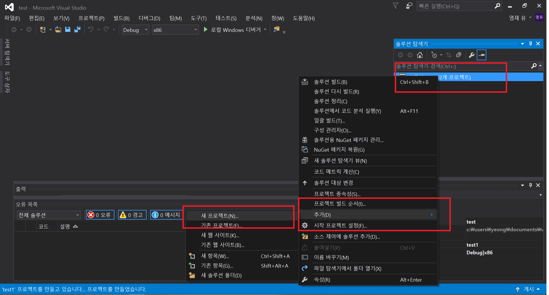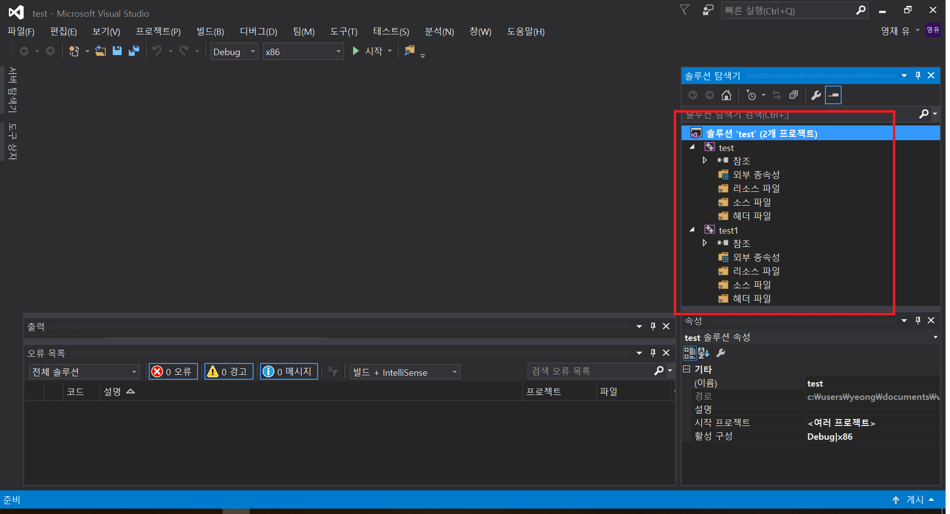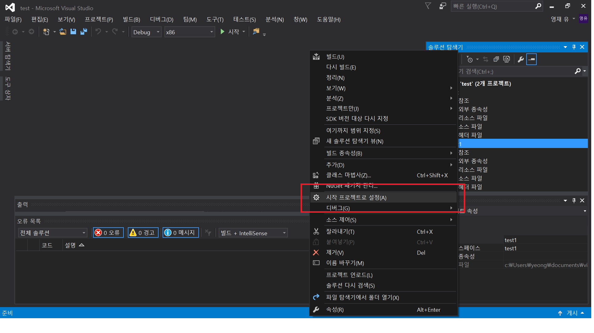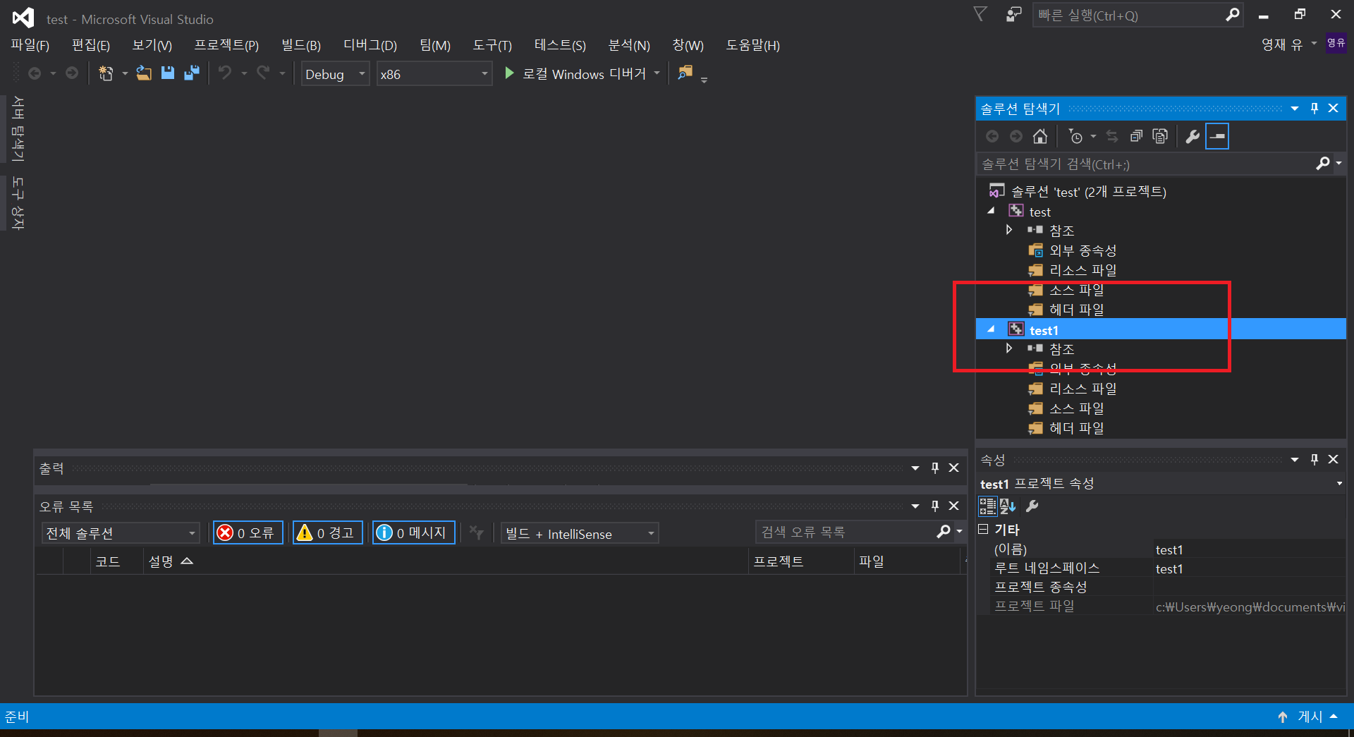다음과 같은 화면이 나타나고, 굵은 글씨 프로젝트가 제어권을 가지고 있기 때문에 제어권을 test1에 주도록 하자