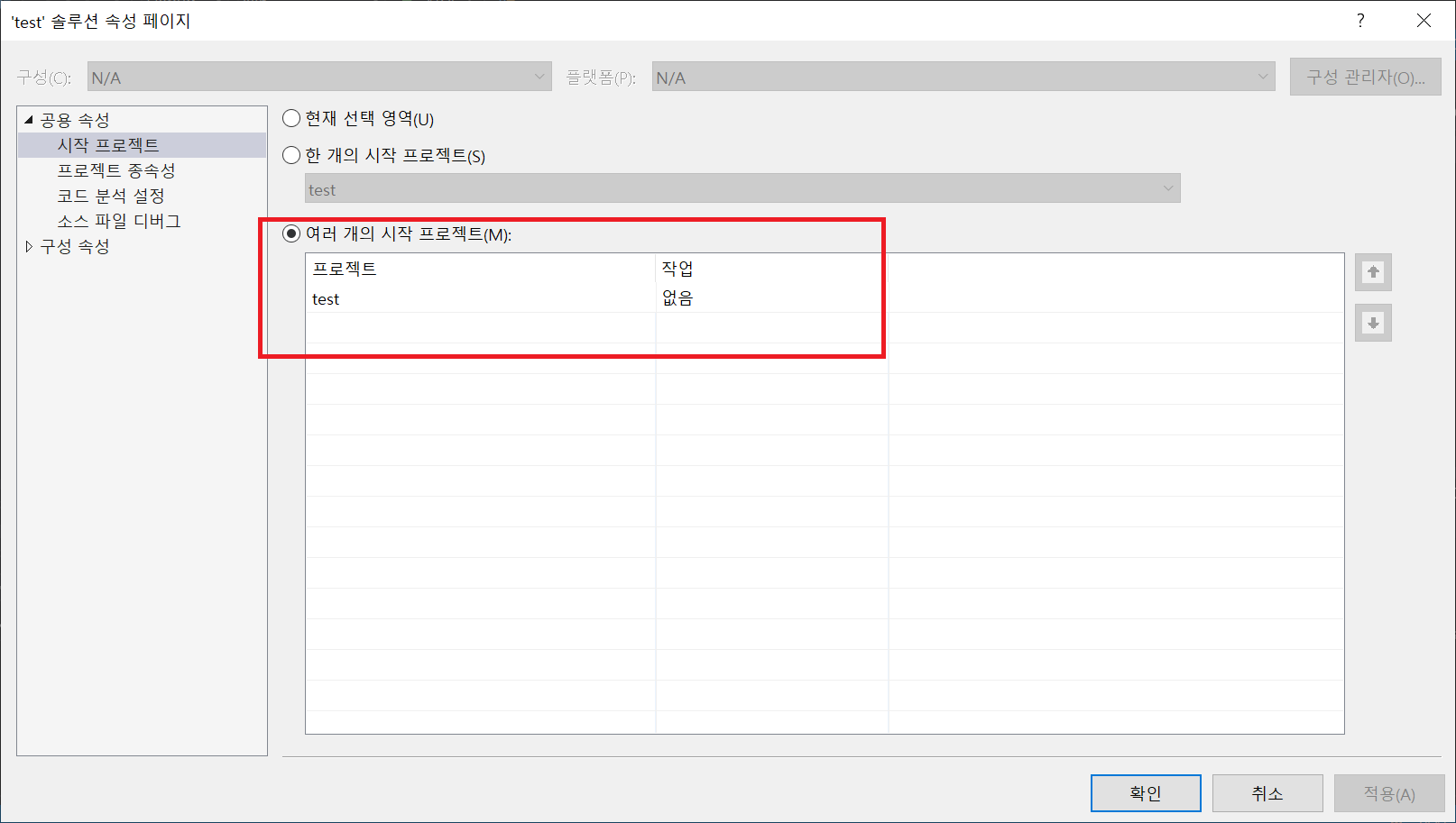 여러 개의 시작 프로젝트 속성을 선택하고 적용을 하고 창을 나간다