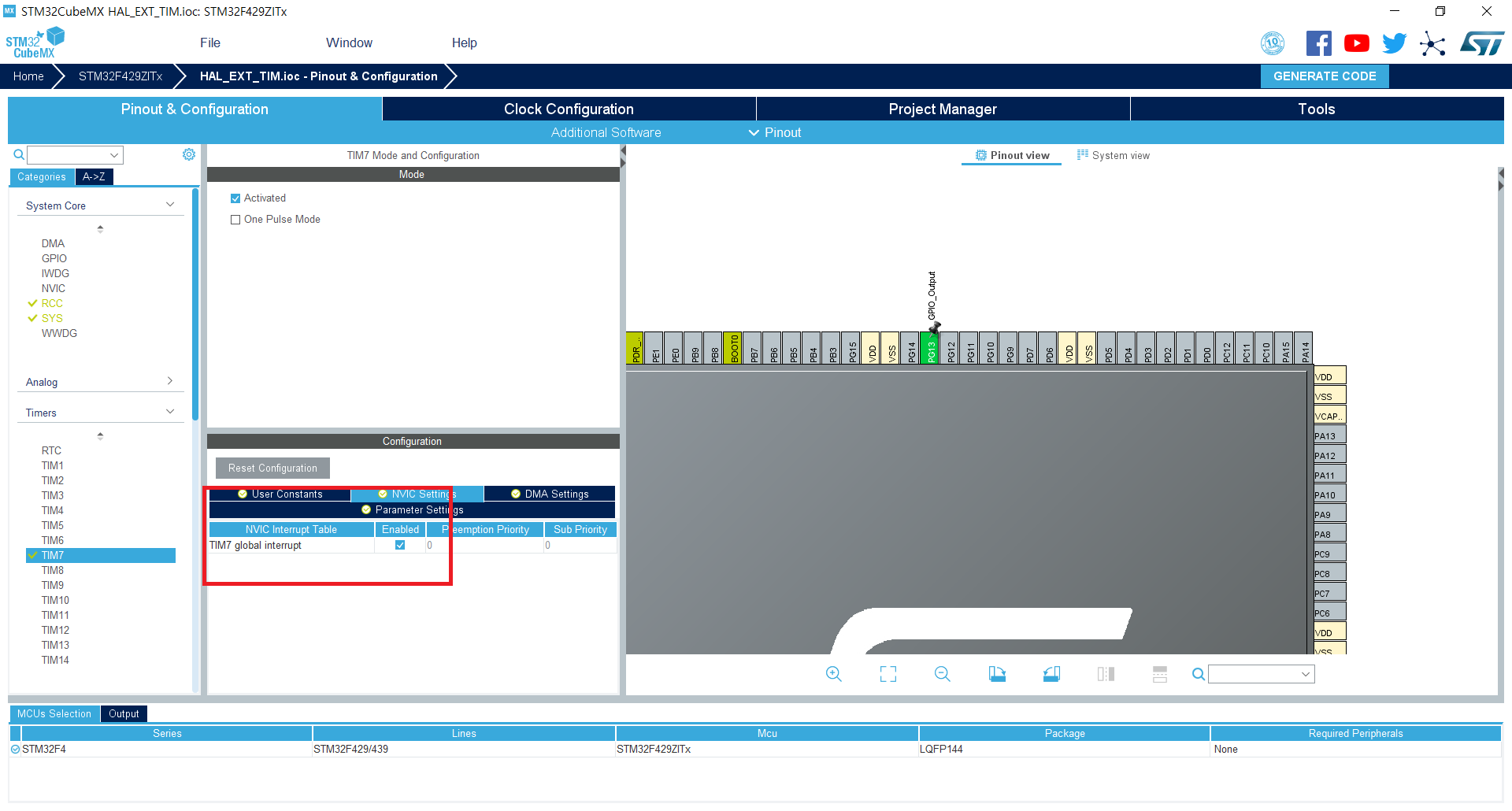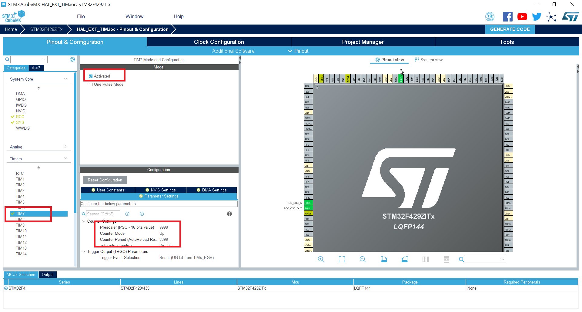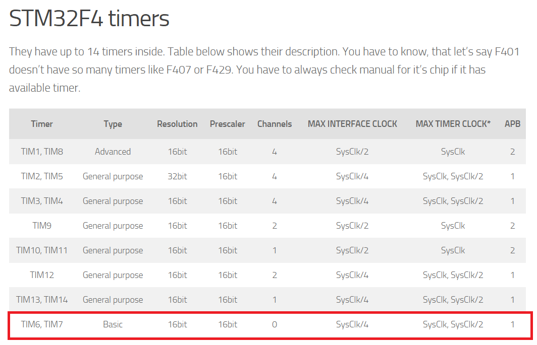 STM32F4 시리즈의 타이머에 대한 요약이다. AVR 시리즈와 다르게 타이머의 유형이 여러 개 존재한다. 일단 이번 예제에서는 PWM이 아닌 카운터만을 이용할 것이기 때문에 Basic 타이머인 TIM7번을 사용할 것이다. TIM7번은 APB1에 연결되어 있다