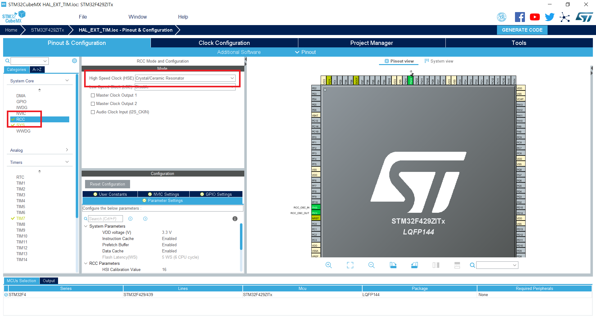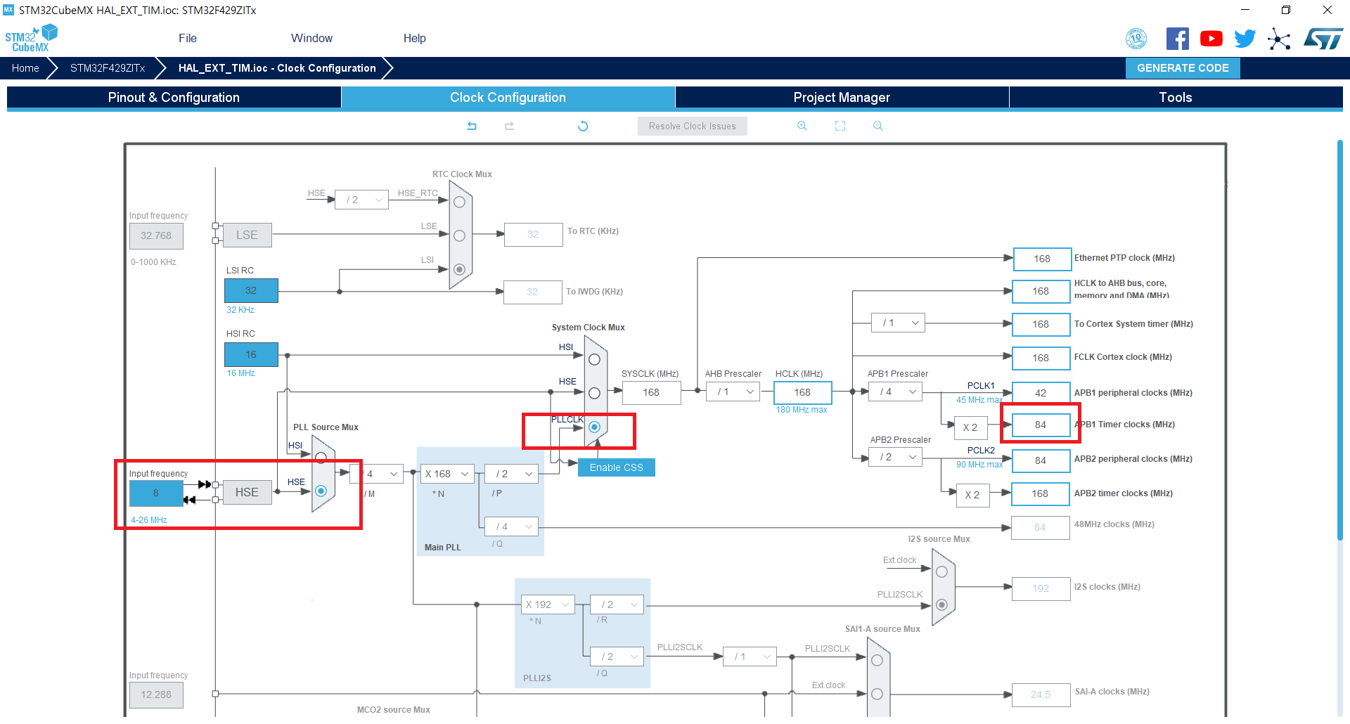 내부 클럭은 오차가 크므로, 보다 오차가 적은 정확한 외부 클럭은 타이머 클럭으로 사용하는 것이 올바른 방법이다. 외부 클럭을 8MHz이므로 만일 잘못 기입이 되어 있다면 8MHz로 수정을 하고 HSE와 PLLCLK를 클릭해서 타이머 7번의 APB1 클럭을 84MHz로 맞춘다