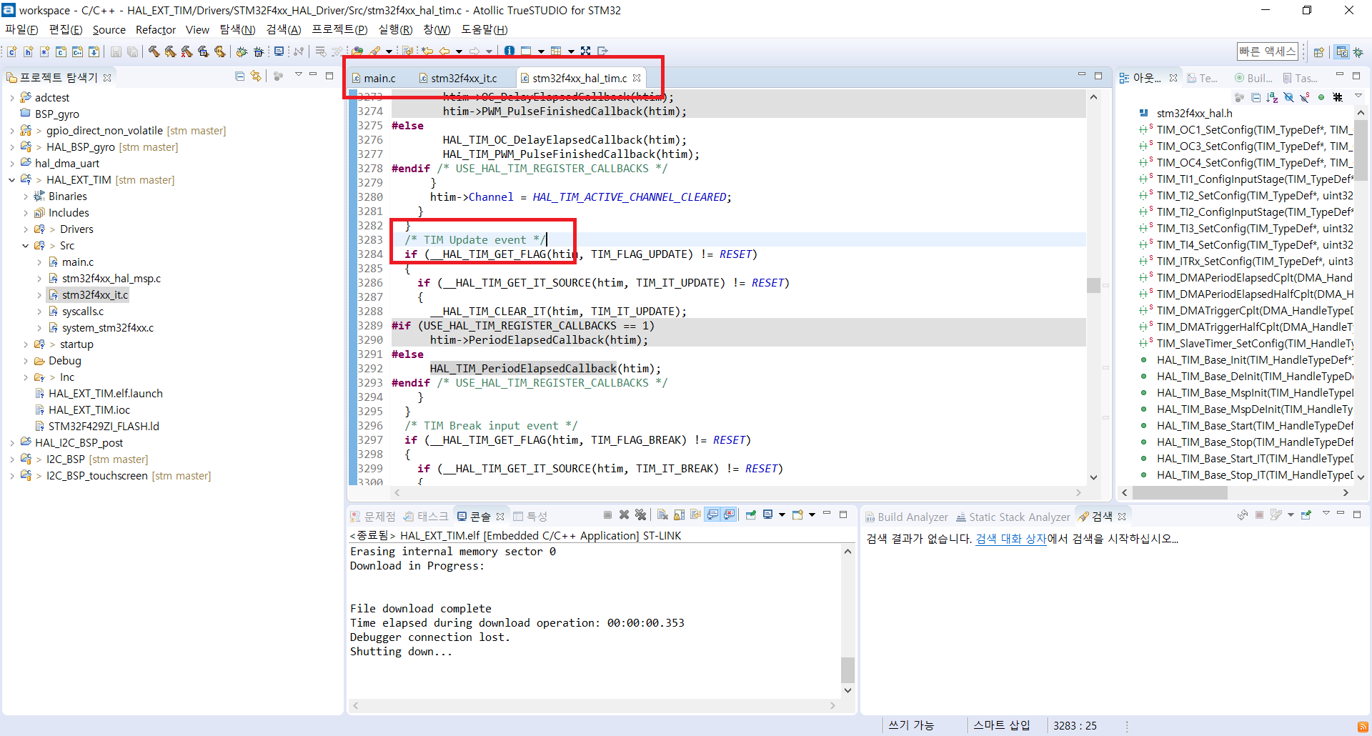 프로젝트 상에서 타이머 인터럽트 부분을 보면, 타이머 update 부분인 갱신될 때의 인터럽트 소스를 보면 결국엔 HAL_TIM_PeriodElapsedCallback 함수를 호출하게 된다