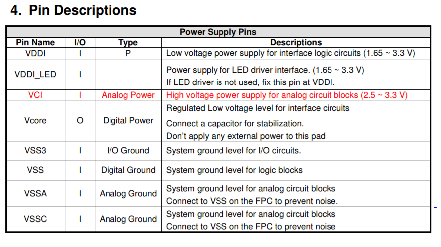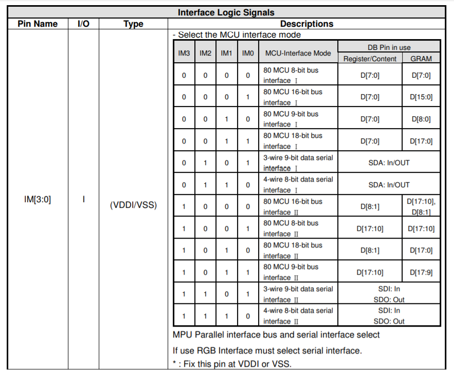 기본적인 SCL, SDA, CSX에 하나 더 데이터와 명령어를 구분하는 핀도 포함되어 있다. 데이터 버스 핀 중 사용하지 않는 핀들은 그라운드로 연결하라고 되어있다.