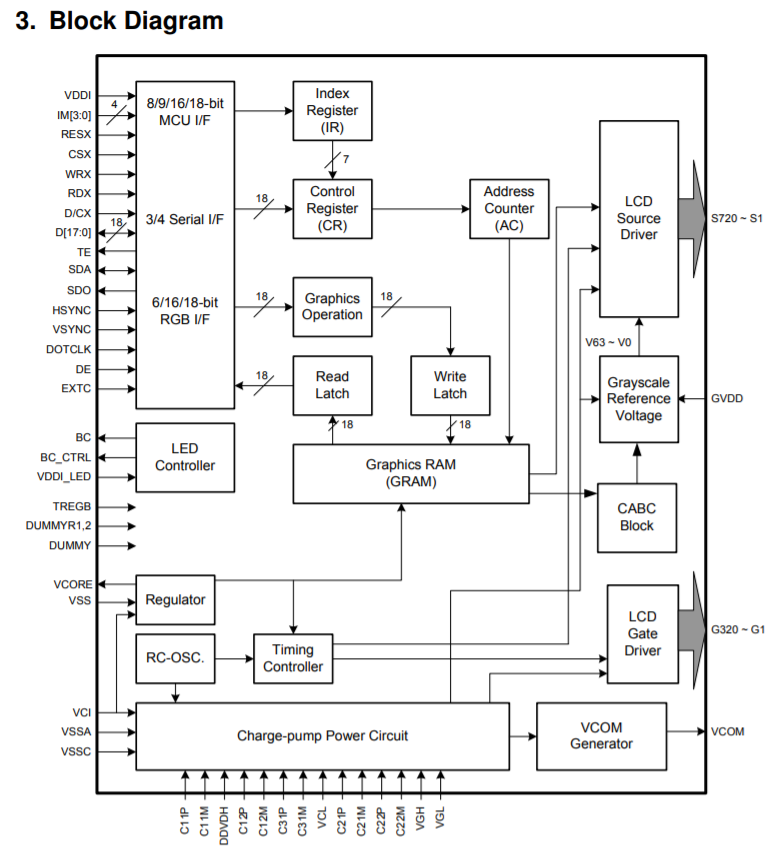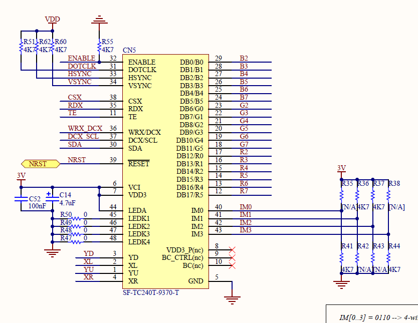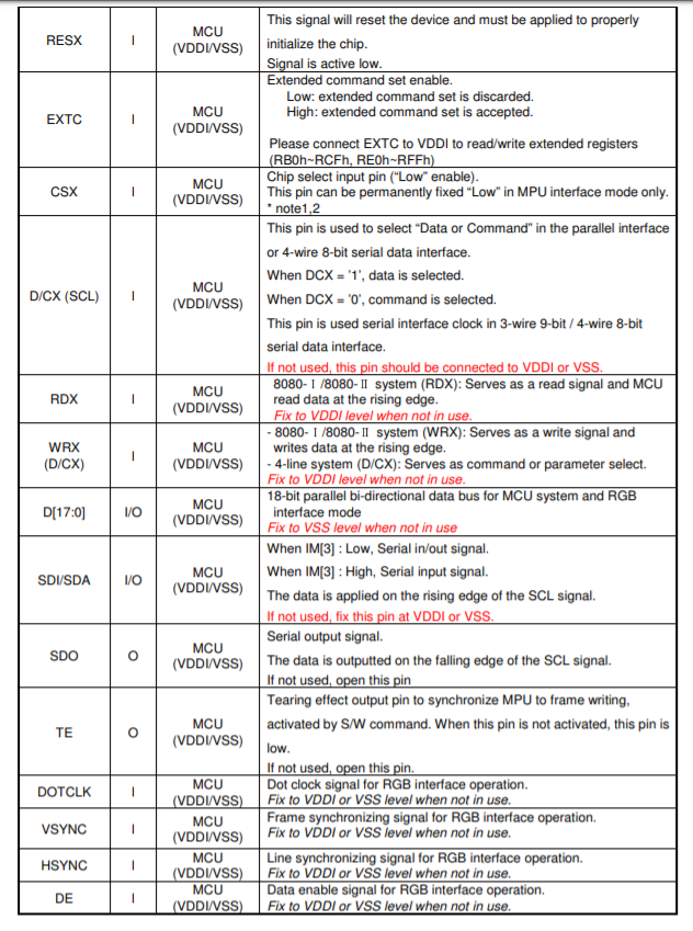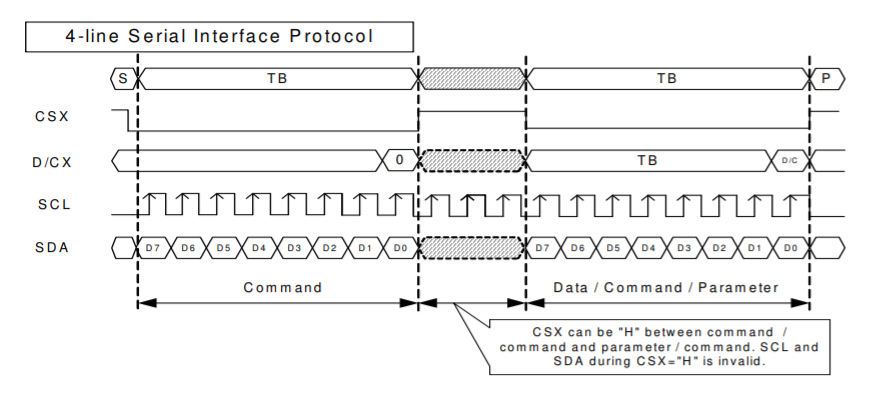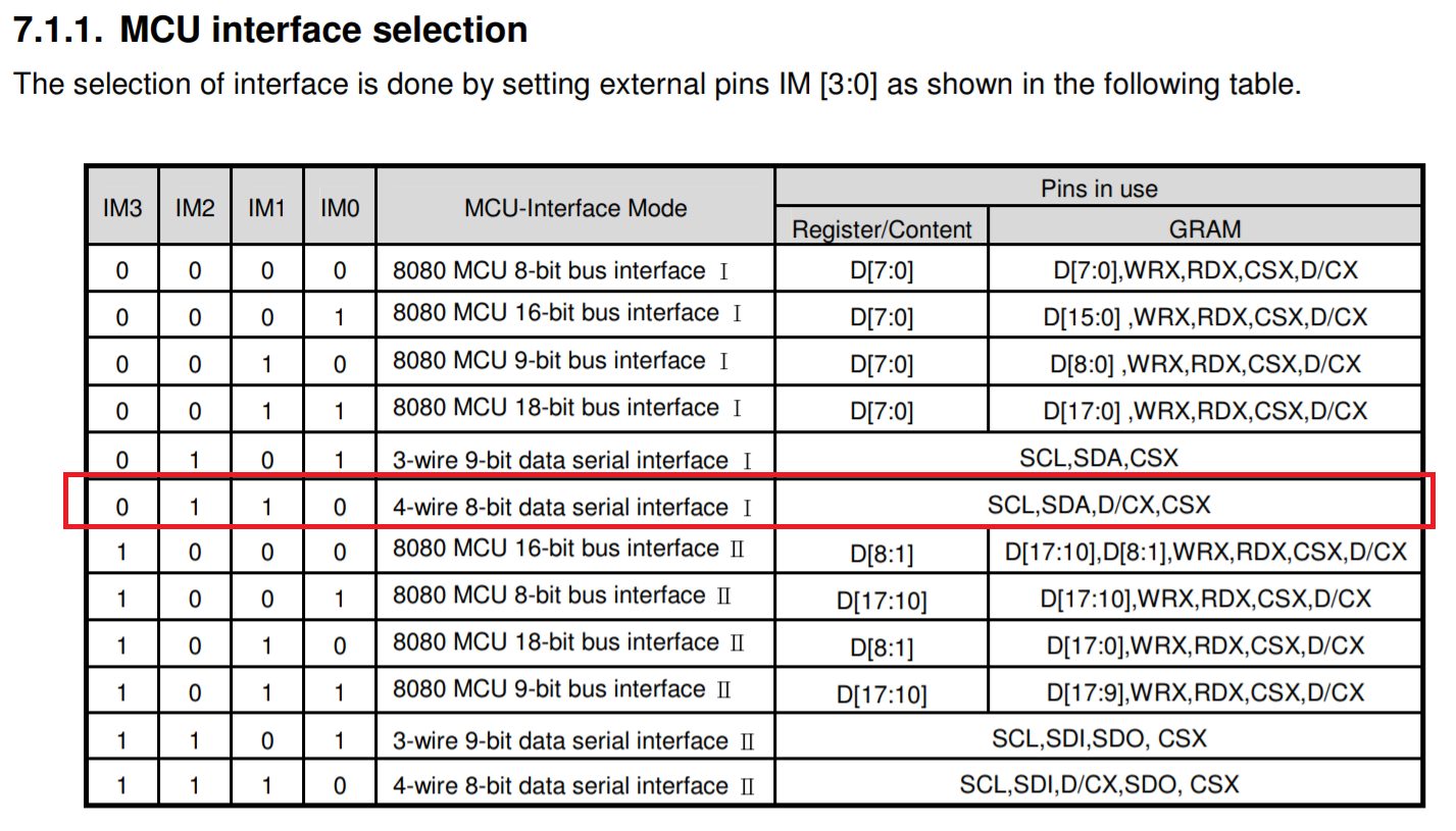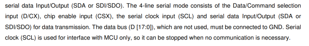 4-wire 8bit SPI 통신을 사용할 것인데, SCL, SDA, D/CX, CSX핀을 사용한다. 여기서는 SPI라고해서 병렬 인터페이스와 비교해 빠르고 느리고를 논하는 것은 무의미하다. 왜냐하면 실제 연결된 이후에 대부분의 데이터 통신은 RGB 인터페이스에서 이뤄지기 때문이다