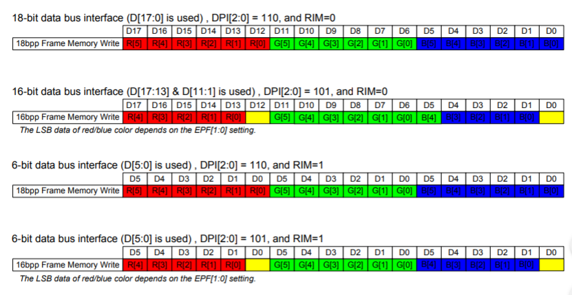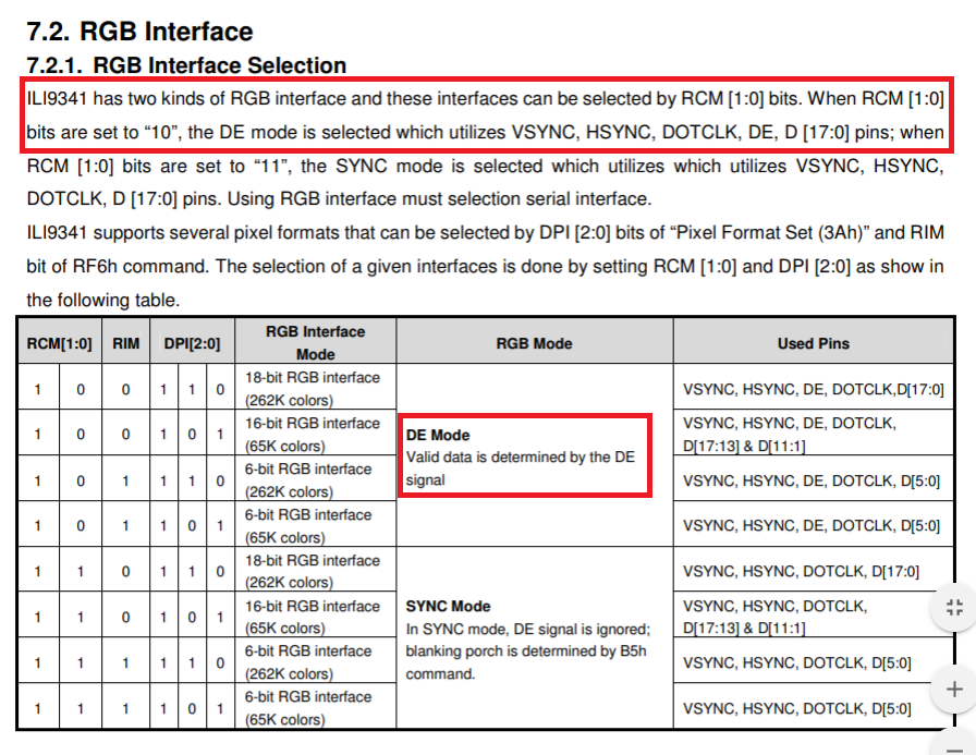 RGB 인터페이스도 MCU 인터페이스처럼 여러가지 모드를 지원하는데, 이번 예제에서는 DE 신호에 의해서 제어되는 DE 모드로 동작시킬 것이다. 그리고 예제에서는 18비트 RGB 인터페이스를 사용하려고 한다