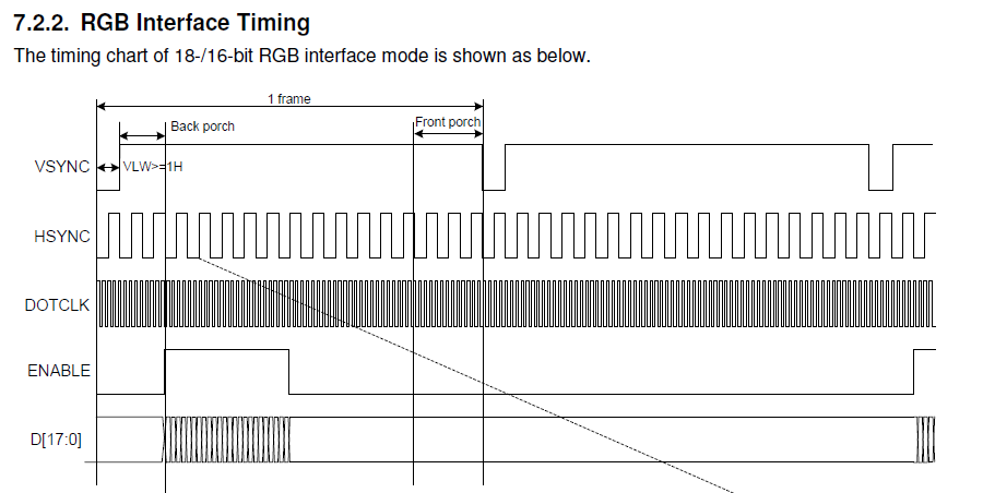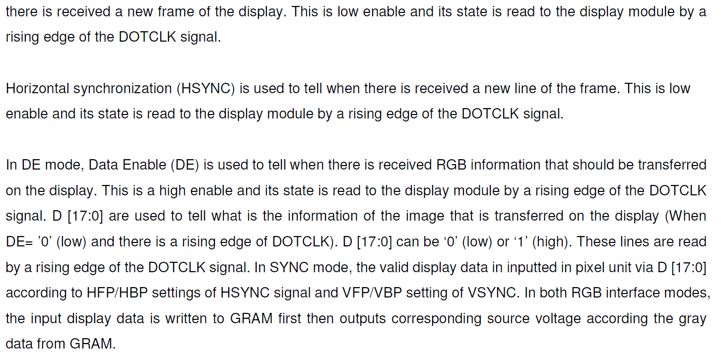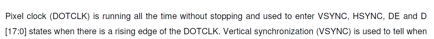 1. DOTCLK의 상승 에지에 동기해서 VSYNC, HSYNC, DE, D[17:0]이 입력되어야 하고, DOTCLK는 멈춤없이 항상 입력되어야 한다