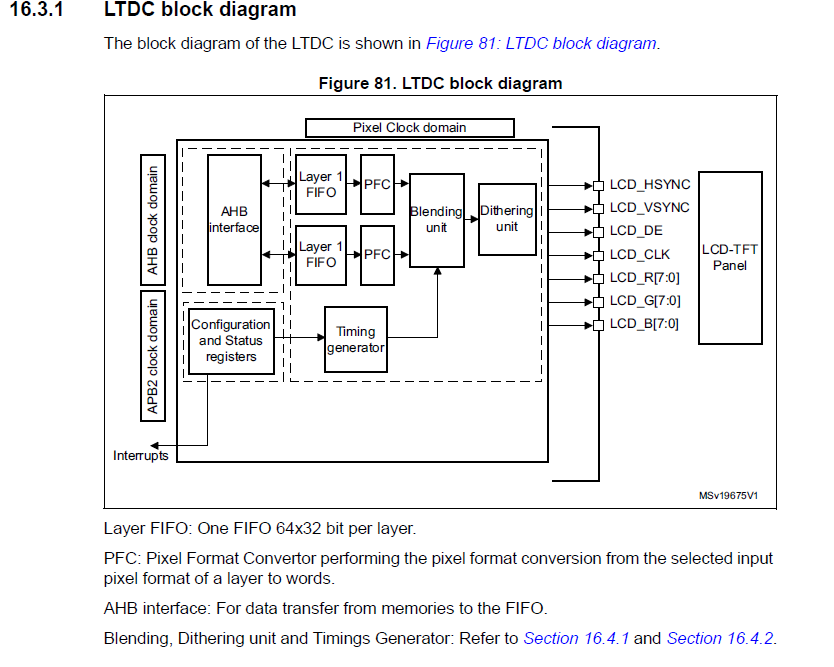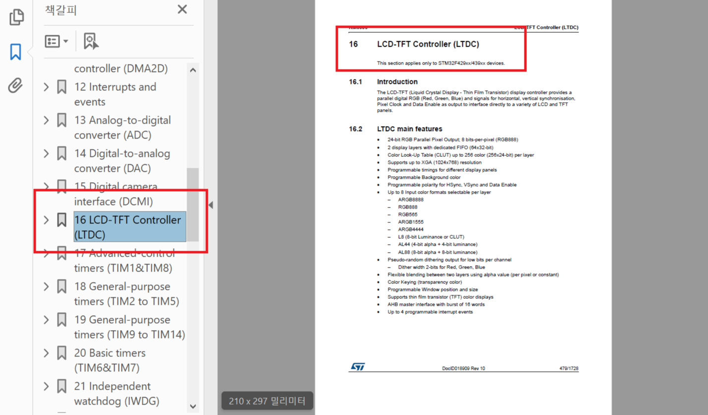 위와 같은 파형을 MCU에서 TFT-LCD에 제공을 해야 한다. 이것은 GPIO로 만들어서 사용할 수 없고, TFT-LCD가 내장되어 있는 MCU를 사용해야만 한다. 아래의 그림과 같이 STM32F4 시리즈의 문서를 보면 TFT-LCD 컨트롤러가 따로 내장되어 있는 것을 알 수 있다