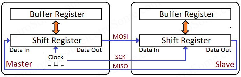 SPI의 마스터와 슬레이브 장치의 데이터 버퍼는 다음과 같이 원형 큐 자료구조를 이루고 있다. 클럭 하나당 데이터들이 한 번씩 Shift 되게 된다. 총 8개의 클럭이 발생하면 마스터 장치의 1바이트 데이터를 슬레이브 장치로 전달하고, 슬레이브 장치의 1바이트 데이터는 마스터 장치로 전달하여 서로 1바이트의 데이터를 교환하는 결과를 얻을 수 있다