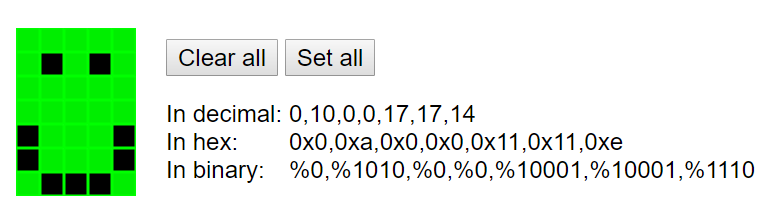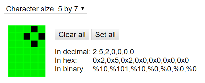 https://www.quinapalus.com/hd44780udg.html 위 사이트에서는 사용자가 원하는 문자를 만들면 이에 맞게 hex 코드를 출력해주게 된다. 위에를 참고하면 섭씨 온도를 표시할 때 °(도)가 따로 없기 때문에 만들도록 할 것이다. 아무것도 사용자 정의 문자를 등록하지 않았기 때문에 Higher order bit가 '000'인 구간에 등록할 것이다