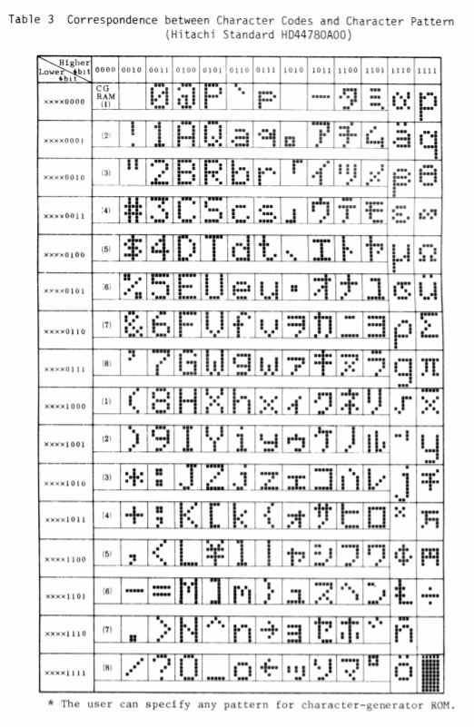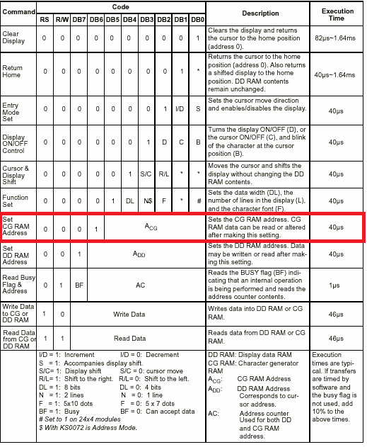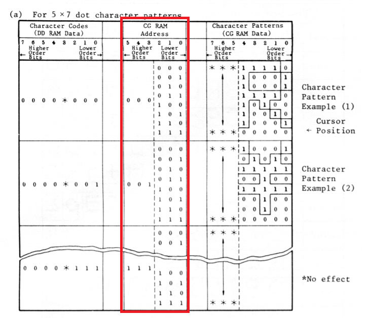 HD44780 LCD 드라이버에는 위의 그림처럼 기본적으로 지원되는 문자 이외의 사용자가 정의해서 나타낼 수 있는 문자 공간이 총 8개가 있다. CGRAM이라 일컫는 메모리 공간으로 5*7 dot 기준으로 8개의 문자를 만들어서 사용할 수 있다