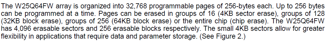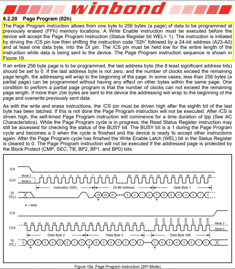 제어하려는 w25q64는 256바이트 크기의 페이지로 이뤄졌다. w25q64는 64M-bit로 8M-byte로 32768*256 = 8M-byte가 나오게 된다. 다음 명령어로 page write 제어를 할 수 있다. 256개를 한 번에 쓰는 것이므로 명령어와 주소를 입력한 후 총 256개의 데이터를 전달하면 된다