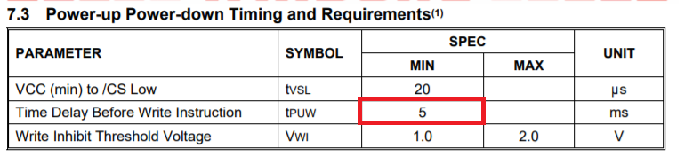 코드를 작성하기 전에, 반드시 Timing 요구 사항을 확인해야 한다. 아래 표를 보면 쓰기 명령 전에는 반드시 5ms를 기다려야만 한다. 기다리는 시간은 SS핀을 Low로 내리기 전 대기하는 시간이다