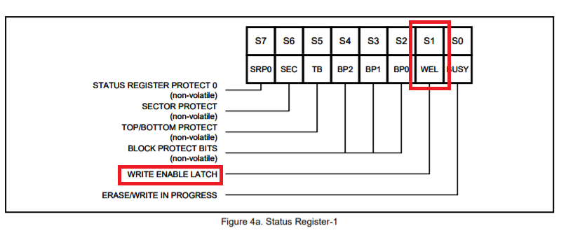 2. Write_enable이 잘 됐는지 상태 레지스터를 검사해야 한다. 05h를 전달한 후 다음 바이트에 1번 비트인 WEL을 검사해서 확인할 수 있다