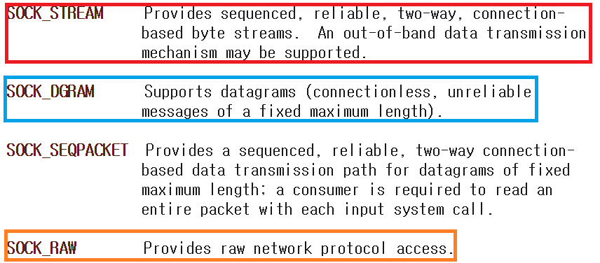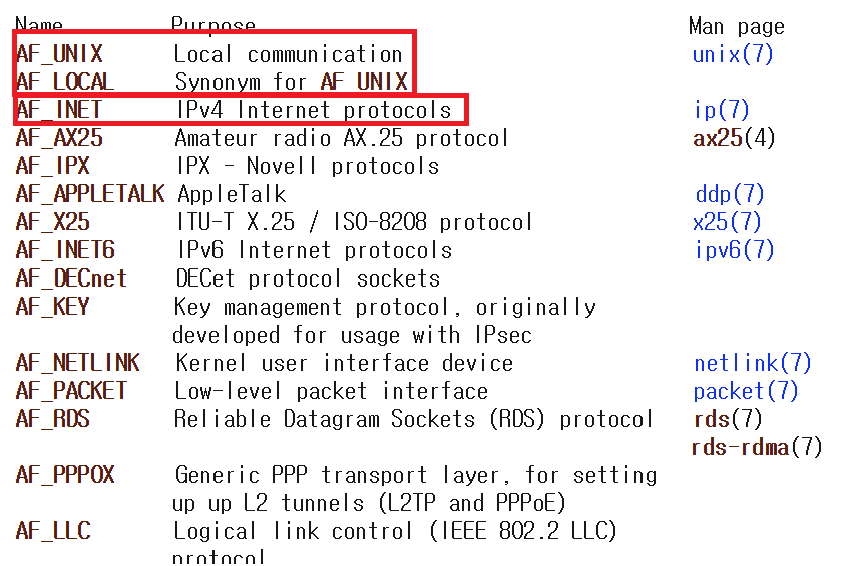 많은 도메인 방식이 명시되어 있는데, 처음에는 빨간색 박스를 유의해서 보면 좋을 것 같다. AF_UNIX는 IPC를 socket 함수를 통해서 하는 방식이고, AF_INET은 IPv4 인터넷 프로토콜을 사용하는 통신 방식을 의미하게 된다